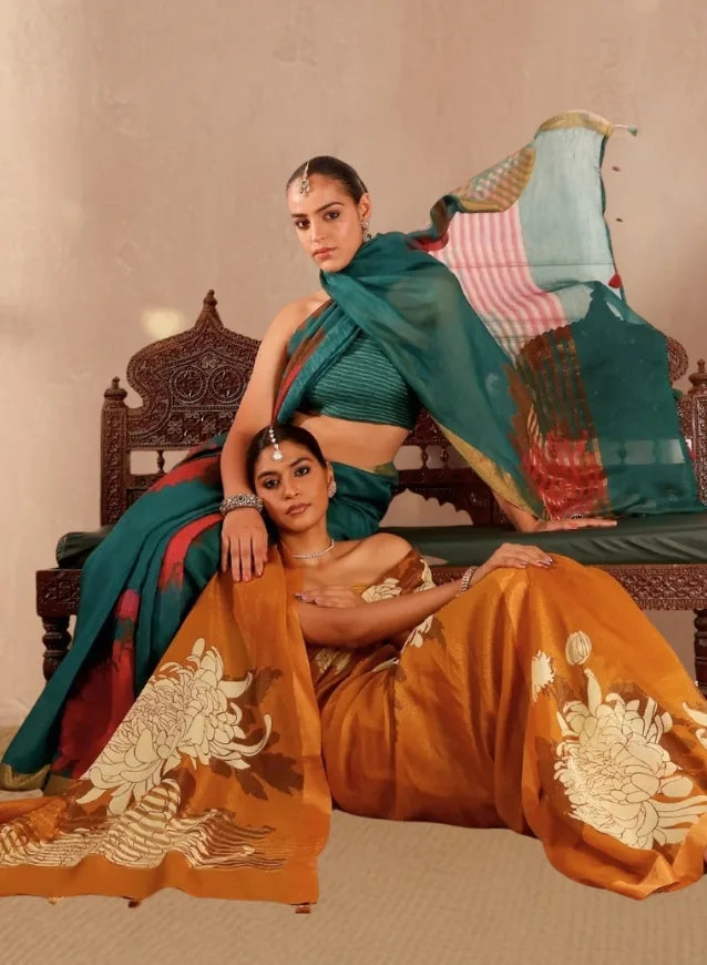 Classy and elegant!Amazing Saree, Easy to drape, beautiful flow, pure katan silk tissue fabric, more than enough width so that anyone who's Tall or with heels vlcan drape it. Wore this on a wedding ceremony and got many compliments. Looks great with contrast blouse.