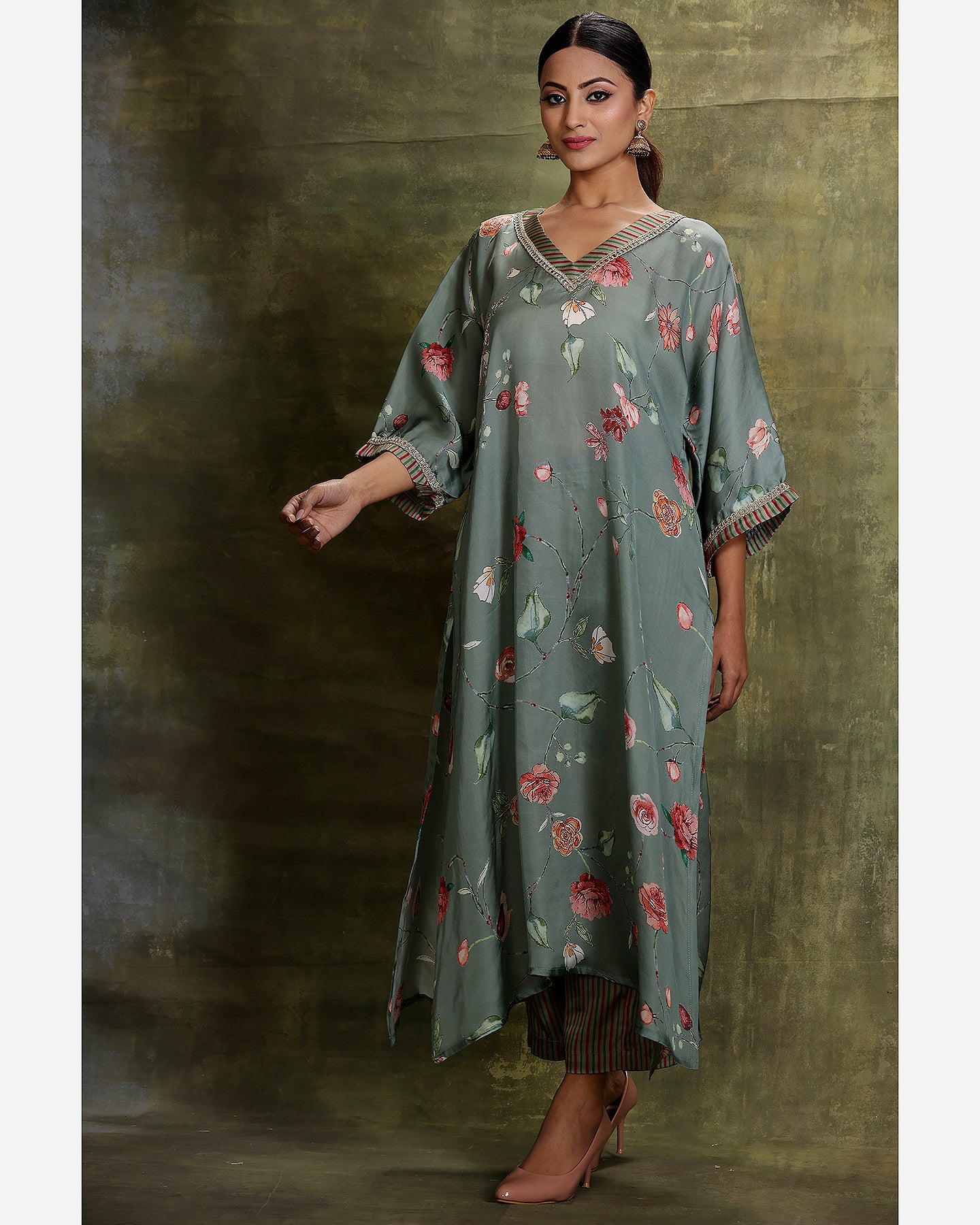 Our classic kaftan kurta in olive green tone and tapered sleeves with embellished neck, and sleeves.
