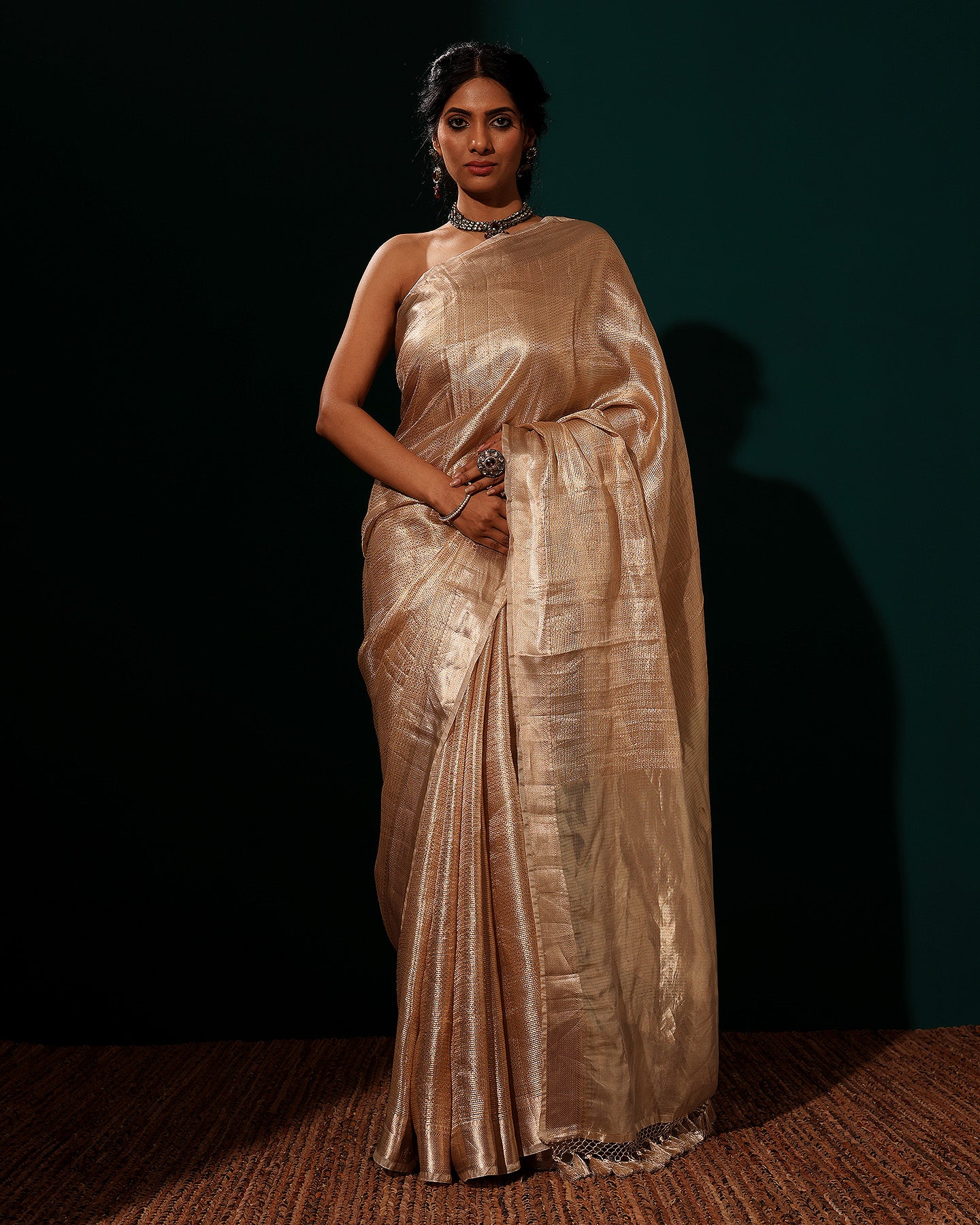 The Banarasi gold tissue saree exudes timeless elegance with its fine craftsmanship and luxurious texture. Woven with intricate patterns using silver metallic threads on delicate tissue fabric, it reflects the rich heritage of Banaras. Ideal for weddings and special occasions, it combines cultural tradition with contemporary allure, making a stunning and sophisticated choice.