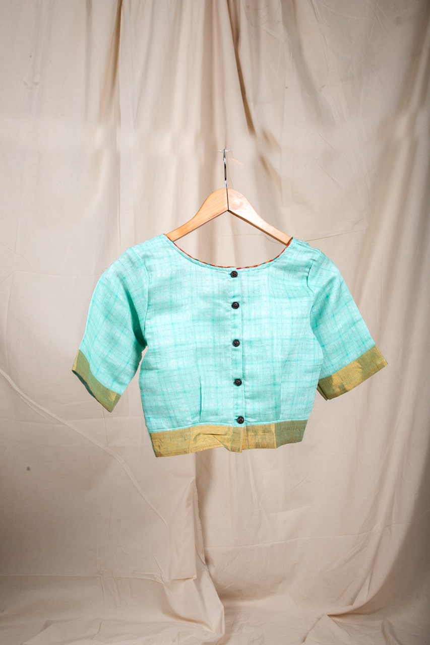 This back open blouse has a multi colour piping at the neck with a simple pleat styling.the sleeves has zari at its end.