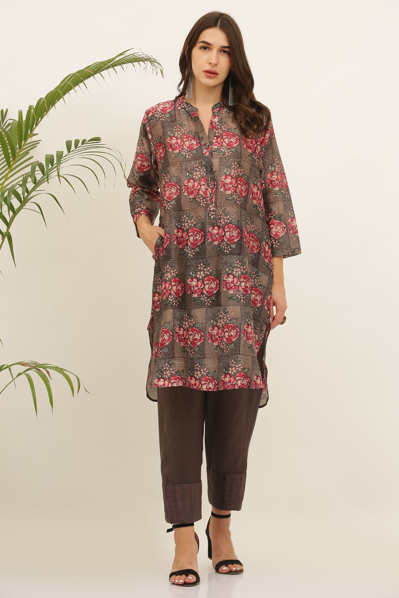 This kurta has a mandarin collar neckline.This classy kurta is chanderi with hand block print.It is paired with pants.
