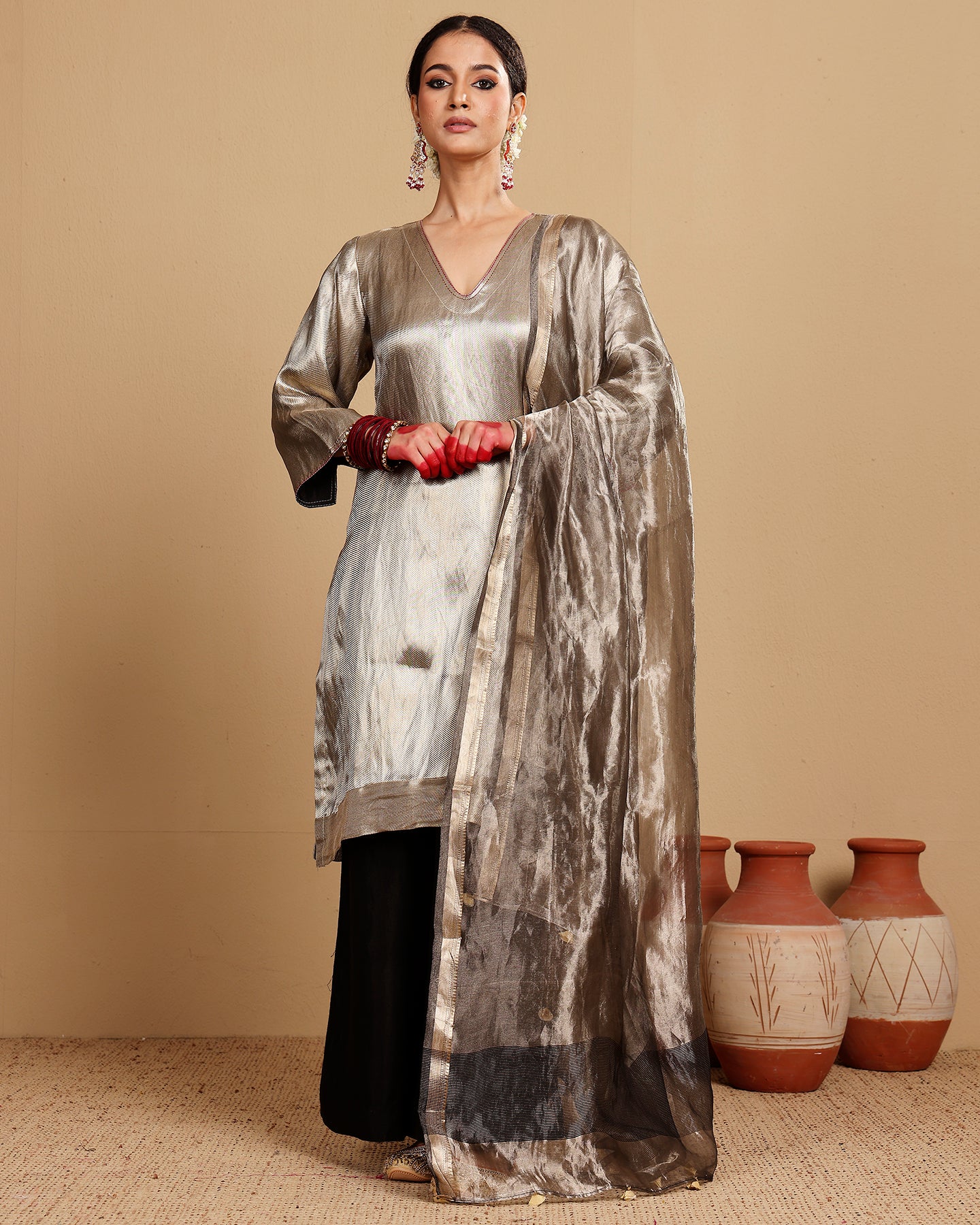 The "Chandini" kurta set in tissue silk is a luxurious ensemble that combines the elegance of tissue silk fabric with intricate designs, making it a popular choice for festive occasions and formal gatherings. Tissue silk is known for its glossy and sheer texture, offering a sophisticated and graceful appearance."