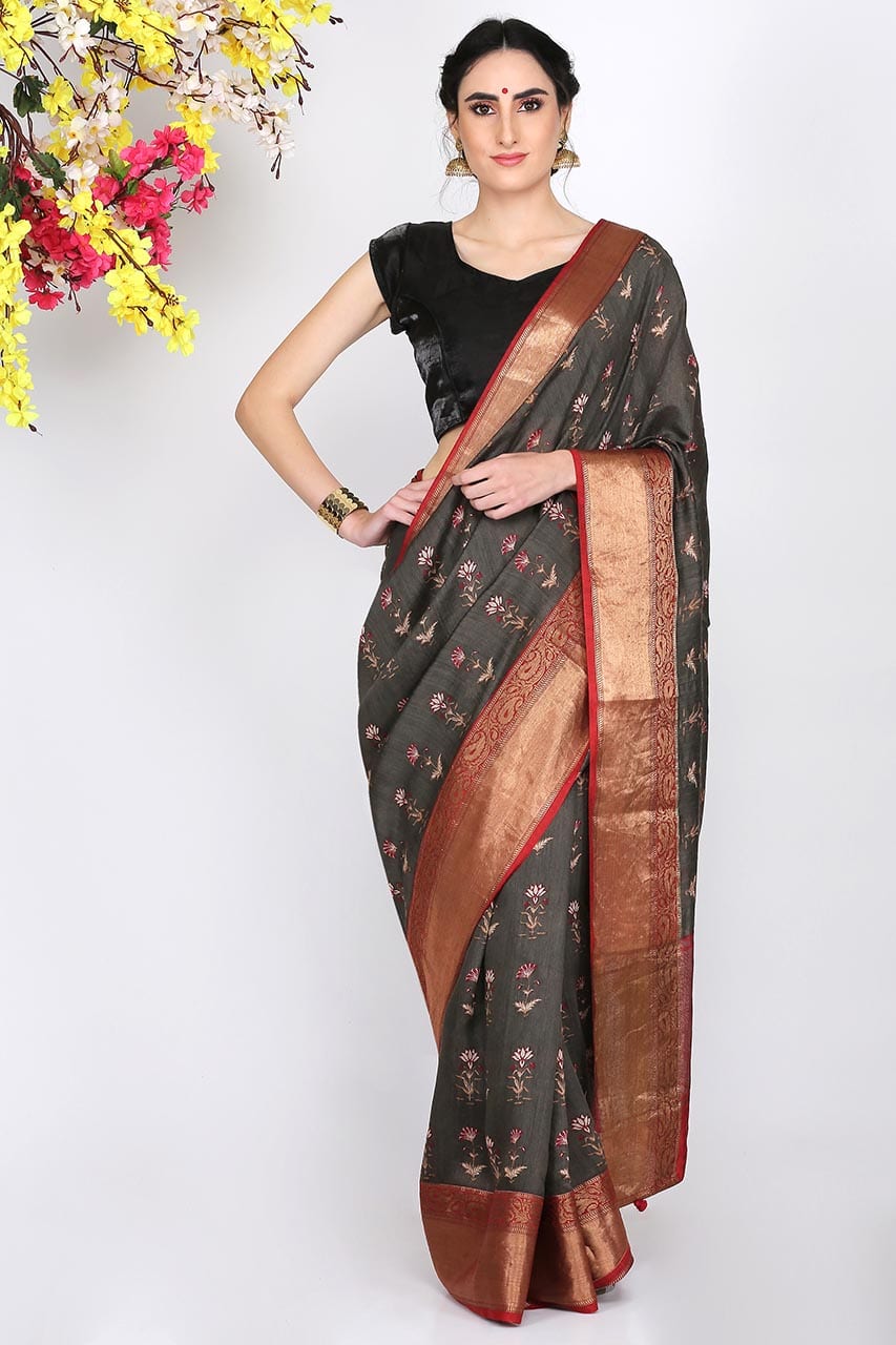 This charcoal grey set of Moonga Silk saree cum blouse coupled with rusty red weaved zari border and indigenous hand block prints is an art of Benarasi Handloom, known for its authenticity and high value.