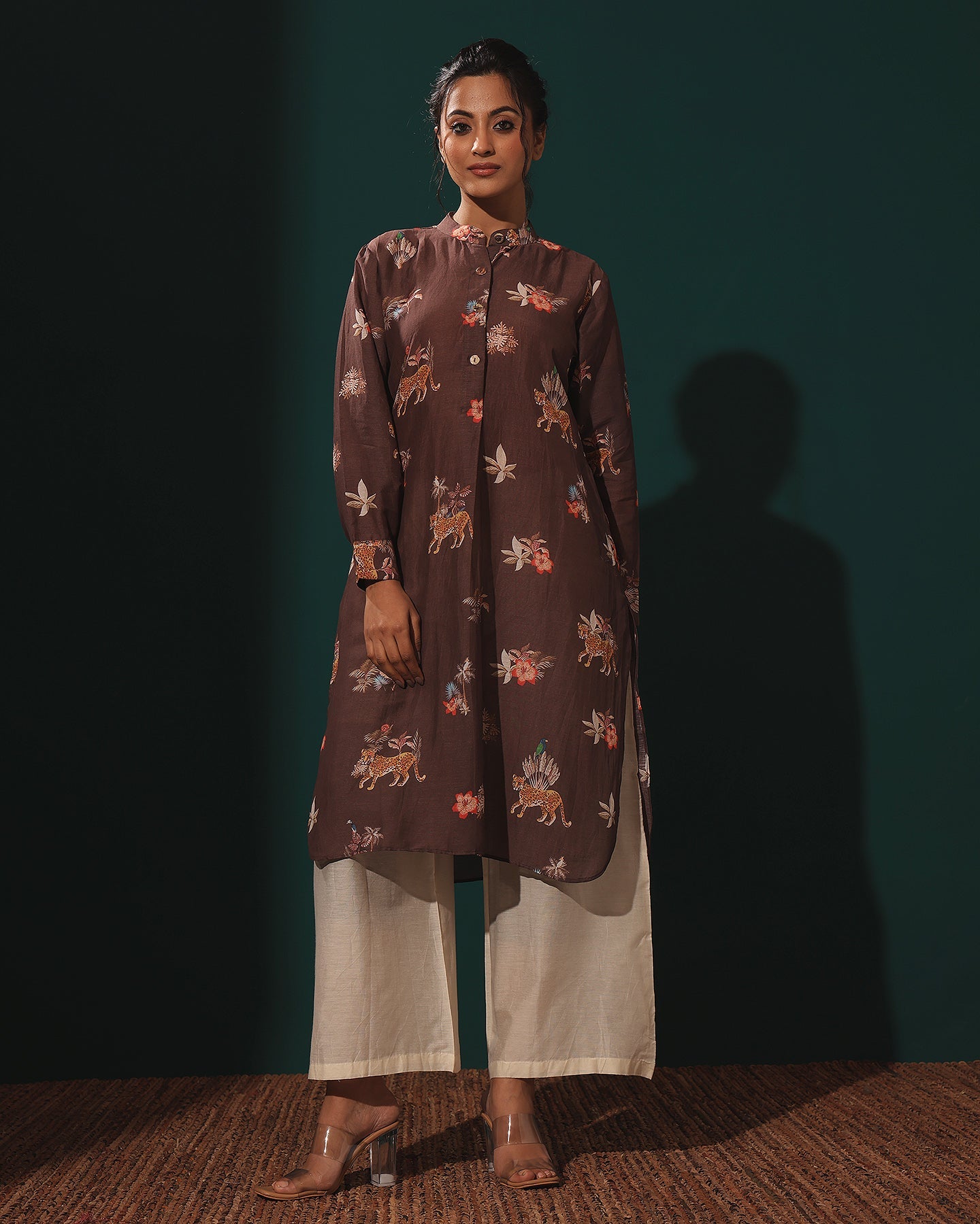 This ensemble prowls with confident might,"Animal print kurta, wild and free.