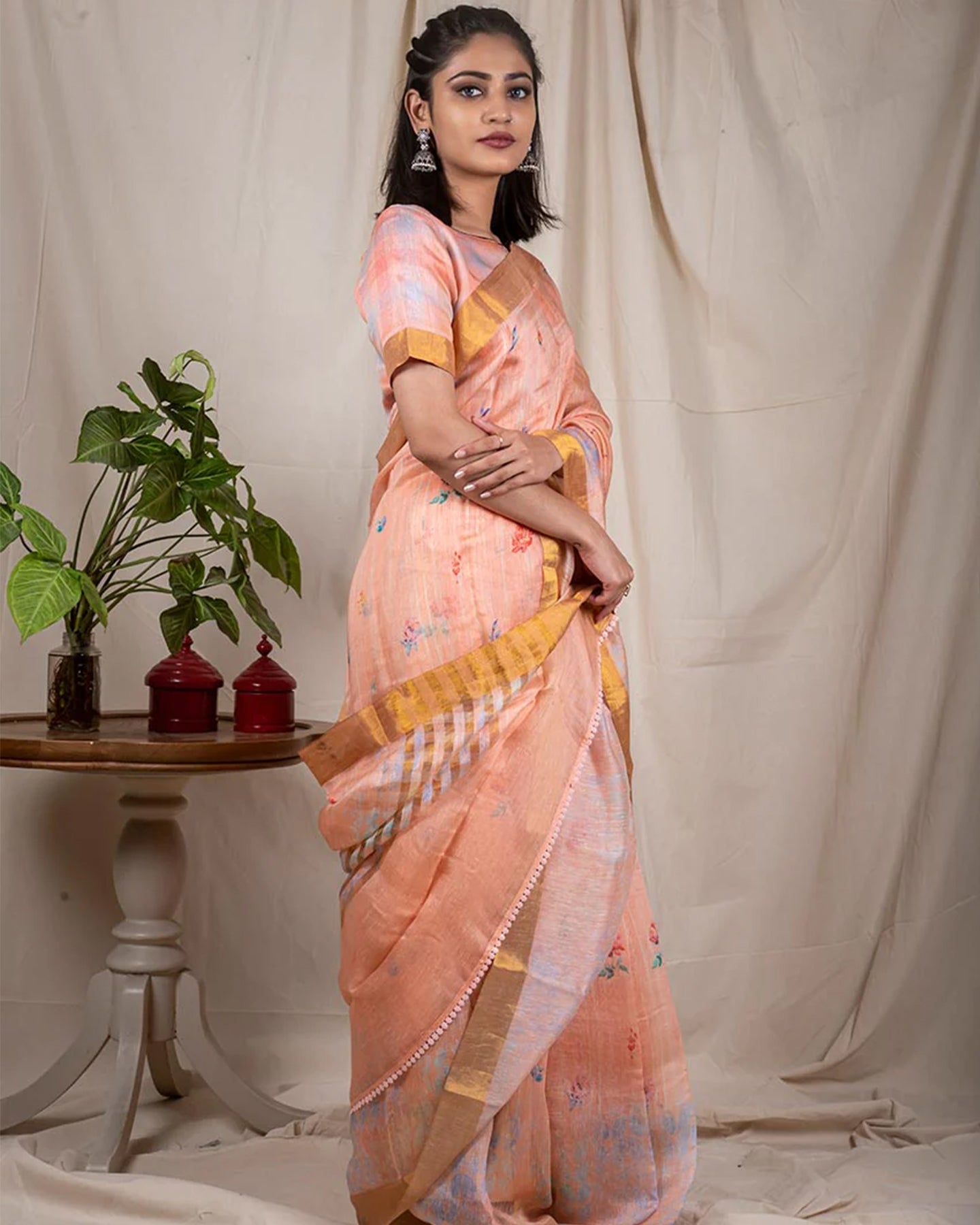 An enchanting coral drape,Adorned with small floral motifs.The beautiful multi colour flower on the body is delicately balanced by multi colour leaves on the pallu and border
