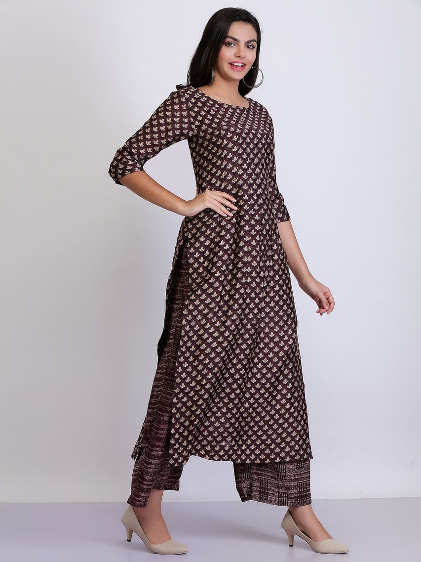 Embellished with systematic floral prints and carrying the sheen of cotton silk, this set of deep plum kurta with palazzo is a thing of immense pleasure. Irregular pleats around the waist inducing a bit of whirlwind effect, it wraps you around in more of a traditional flavor.