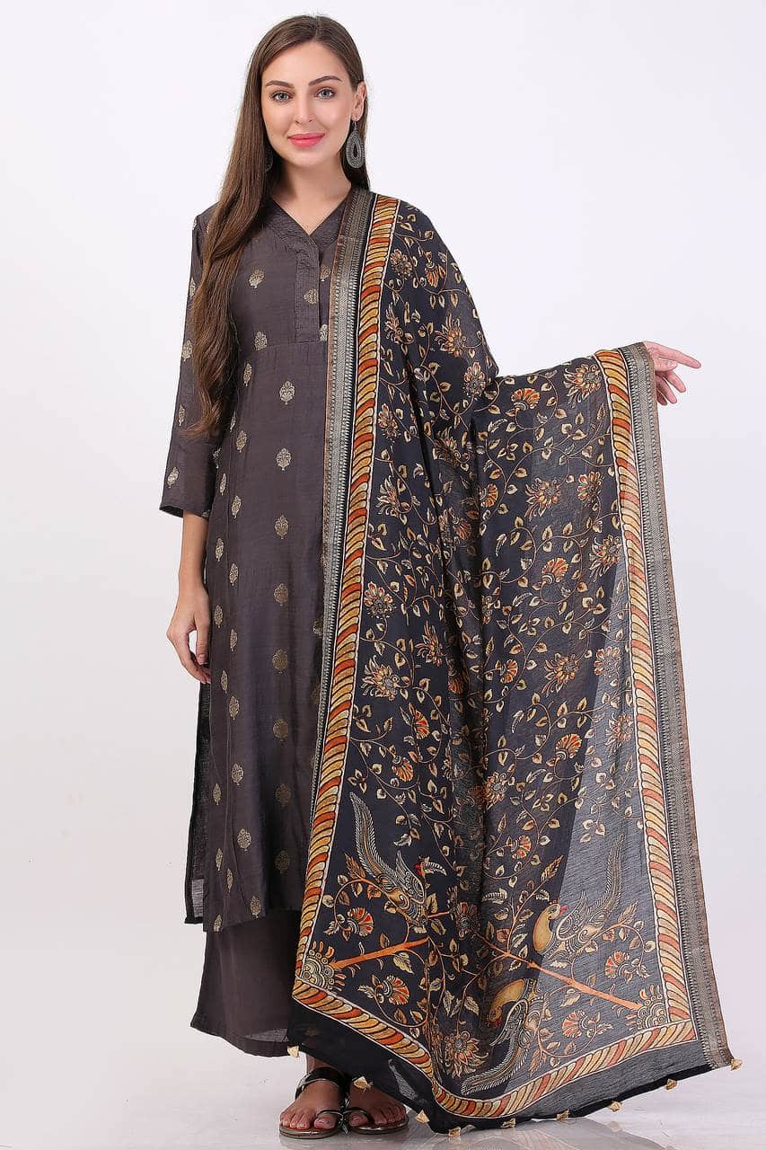 A deep plum stylish kurta with zari anchoring on the neckline gives a formal party look and more beauty is added to it with a beautiful kalamkari dupatta and palazzo to give a complete look