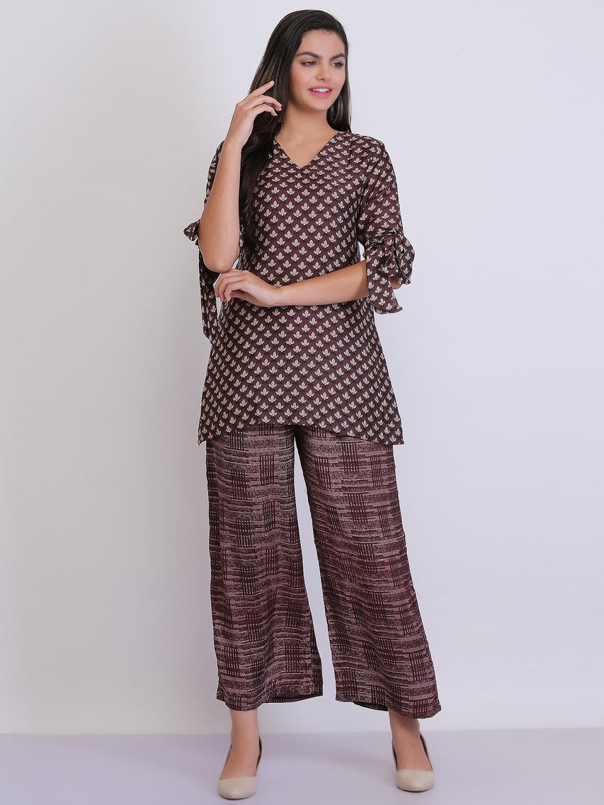 An affordable set of a cotton silk top and classic palazzo, brimming with superior qualities of authentic cotton silk. This combo of deep plum cotton silk top and palazzo makes you establish your own style statement oozing out with immense confidence.