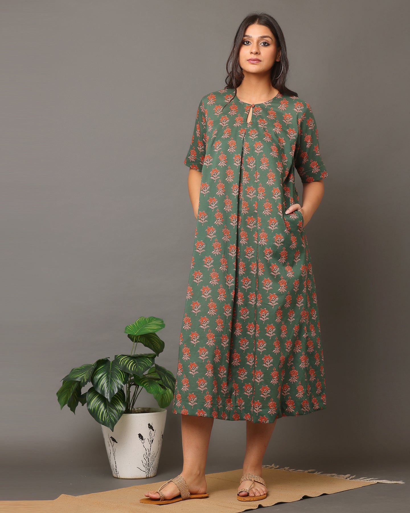 Embrace a natural aesthetic with this earthy green floral dress. The subdued earthy green tone adorned with delicate floral motifs creates a harmonious blend of simplicity and elegance, making it a versatile choice for both casual days and outdoor occasions.