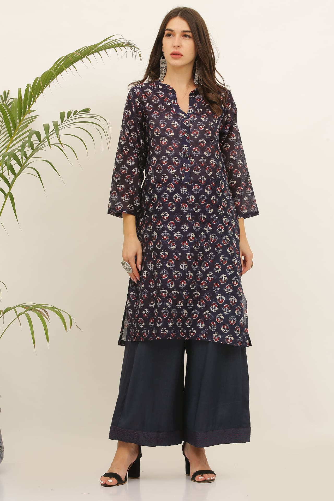 So attractive so stylish and yet so classy.This chanderi kurta in block print has floral motifs.The kurta is paired with Navy blue flared palazzo.