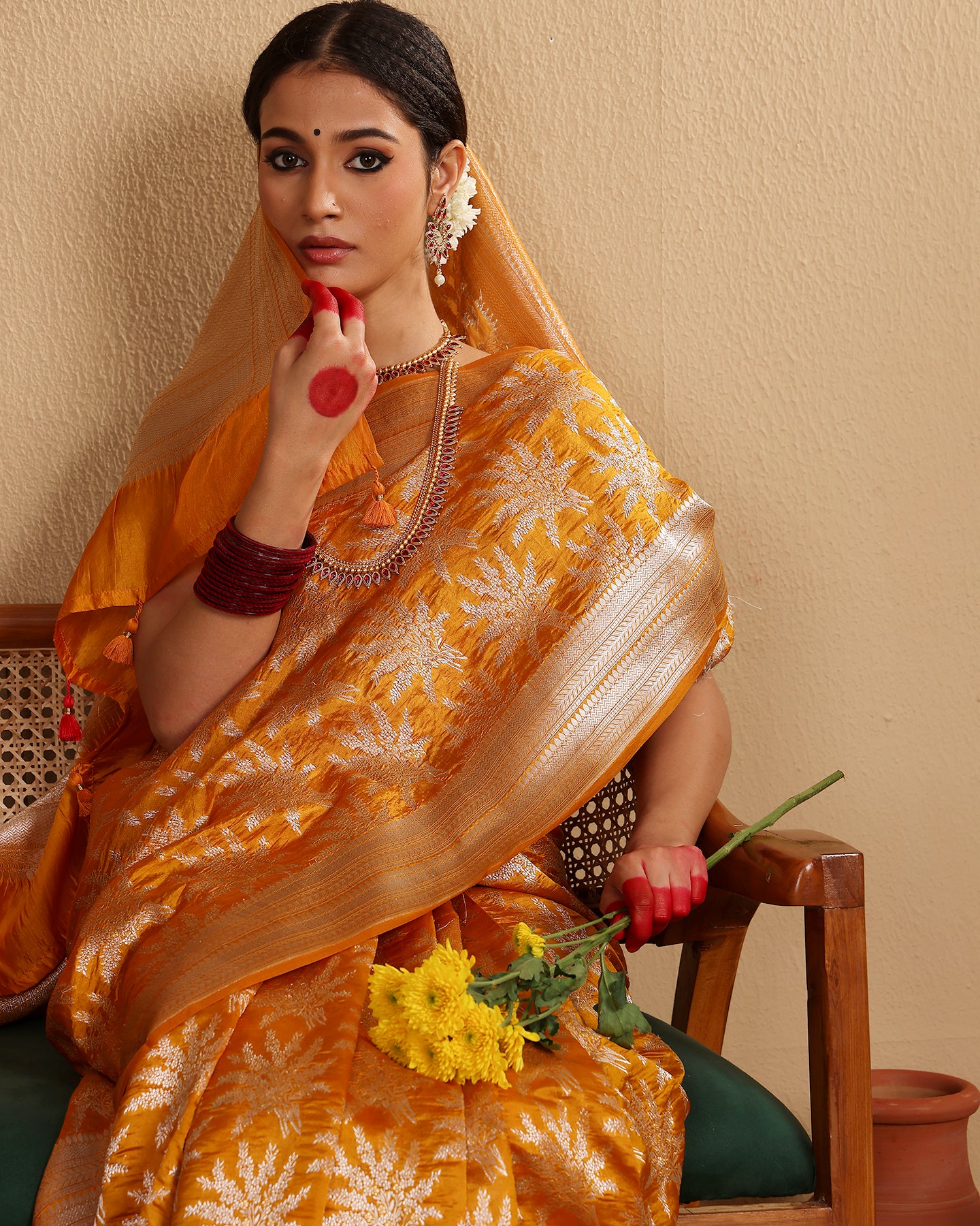 The Gold Mustard Woven Saree with Woven Flowers and Traditional Borders is a stunning representation of timeless elegance and craftsmanship. Its rich gold mustard hue radiates warmth and sophistication, making it perfect for festive celebrations and special occasions. The intricate woven flowers add a delicate charm, enhancing the saree's beauty and creating a harmonious design. The traditional borders feature detailed patterns that pay homage to classic weaving techniques, adding a regal touch. This saree is an exquisite choice for anyone looking to make a graceful statement while celebrating heritage and style.