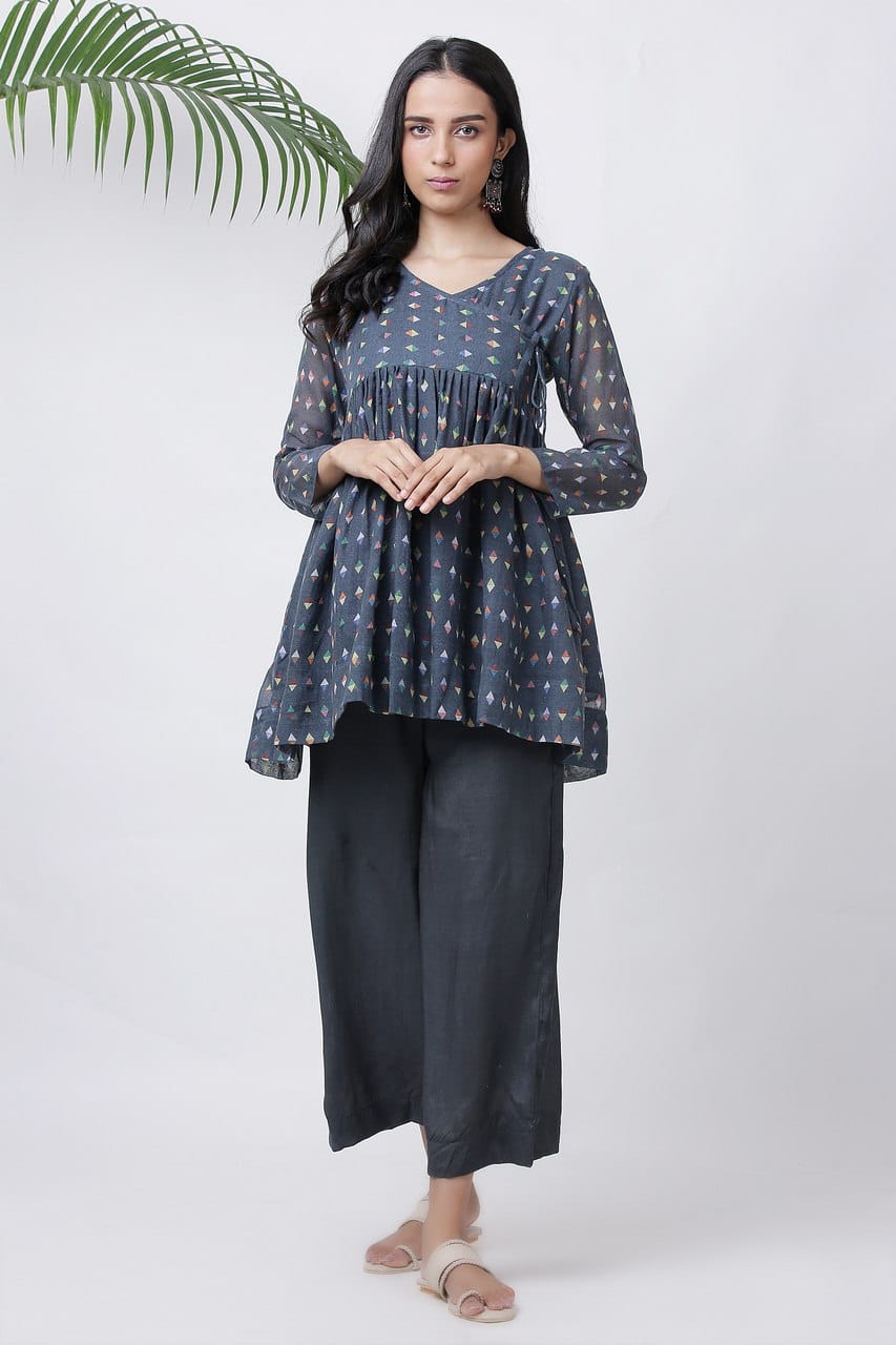 Flare angrakha top with dori and tassels in stylish design teamed with ankle length pants.