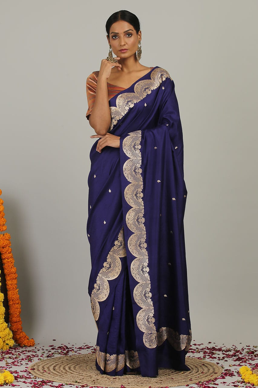 Yards of endearing banarasi weave to warp you. The saree has a small khadwa boota and highlight the gorgeous scallop border.The sumptuous fabric and bold colors  makes this piece stand out for its refined allegiance.