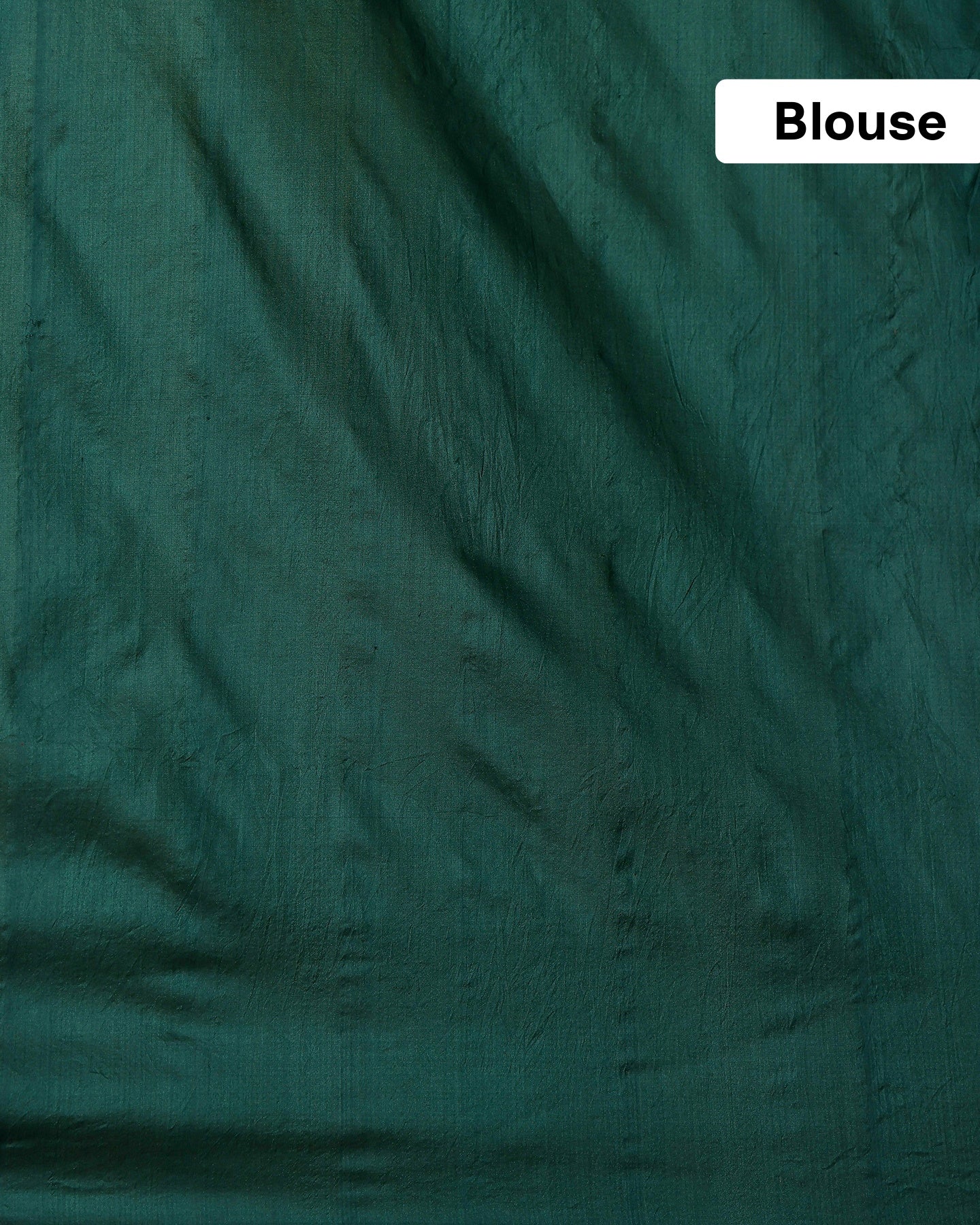 A masterpiece of royal artistry, this emerald green banarasi handloom woven saree captures the essence of regal grandeur and timeless craftsmanship. Handwoven in pure silk, its deep green base shimmers with a natural luster, adorned with exquisite silver and gold zari motifs inspired by traditional peacock and floral patterns. The intricate kadwa weaving technique lends each motif a raised texture, giving depth and dimension to the saree’s surface. The broad border, enriched with antique gold zari and delicate line detailing, frames the drape with a perfect balance of opulence and grace. The pallu unfolds in rich metallic hues, completing the look with a touch of ceremonial magnificence. Styled with heritage kundan jewellery and jasmine adornments, the saree exudes an aura of royal femininity — poised, powerful, and poetic. A true heirloom from the looms of banaras, this saree celebrates the eternal bond between tradition and elegance.