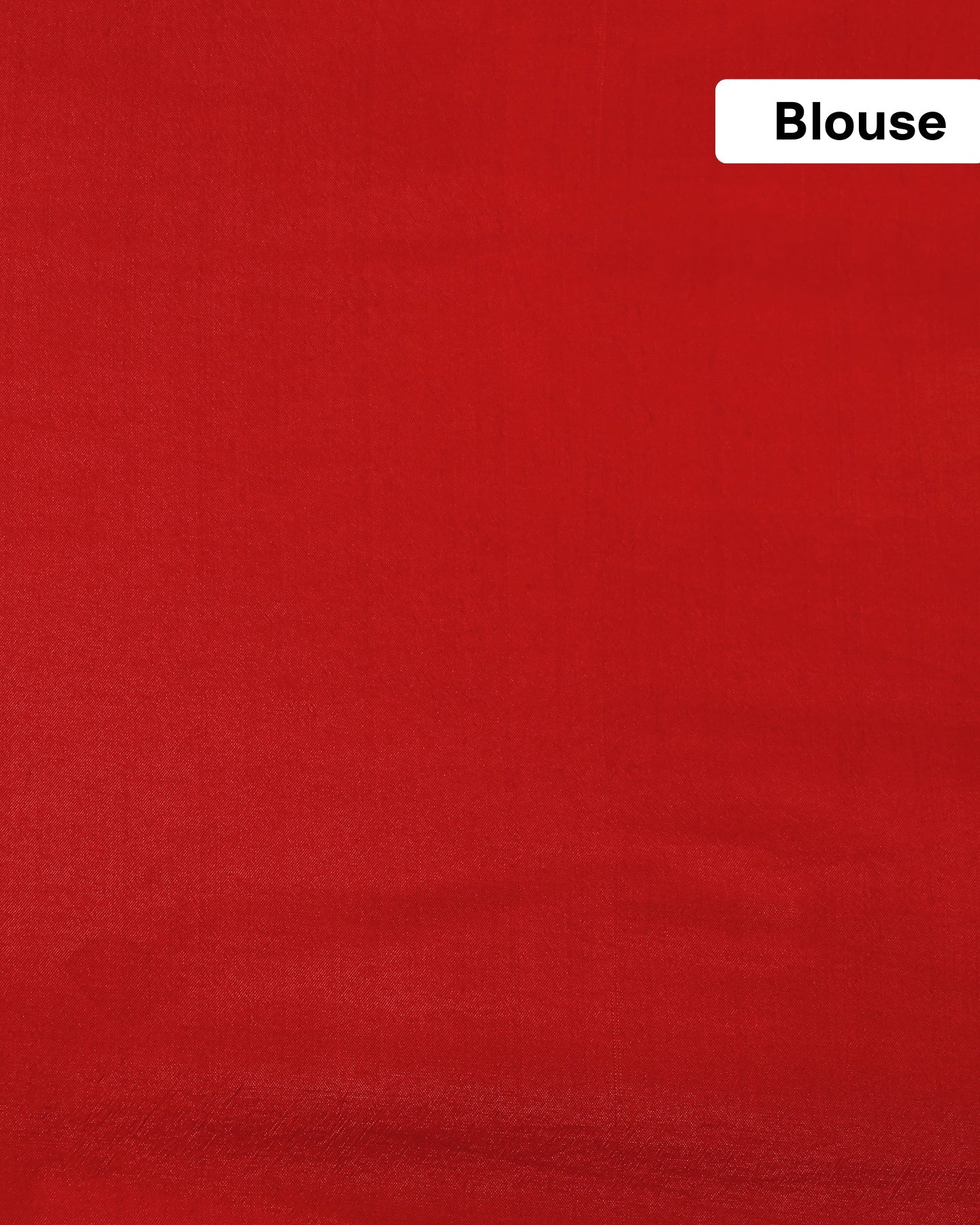 This exquisite red handloom tissue silk saree captures the essence of understated opulence. Woven with a delicate blend of silk and zari, the fabric exudes a subtle golden sheen that glows beautifully under warm light. The saree’s self-patterned weave adds quiet texture, while its fine zari border lends a hint of regal charm without overpowering its elegance. Draped fluidly, it reflects light with every graceful movement — light, airy, and effortlessly refined. Perfect for festive evenings and timeless celebrations, this saree embodies a harmony of earthy warmth and metallic brilliance, making it a true symbol of modern heritage and classic allure.