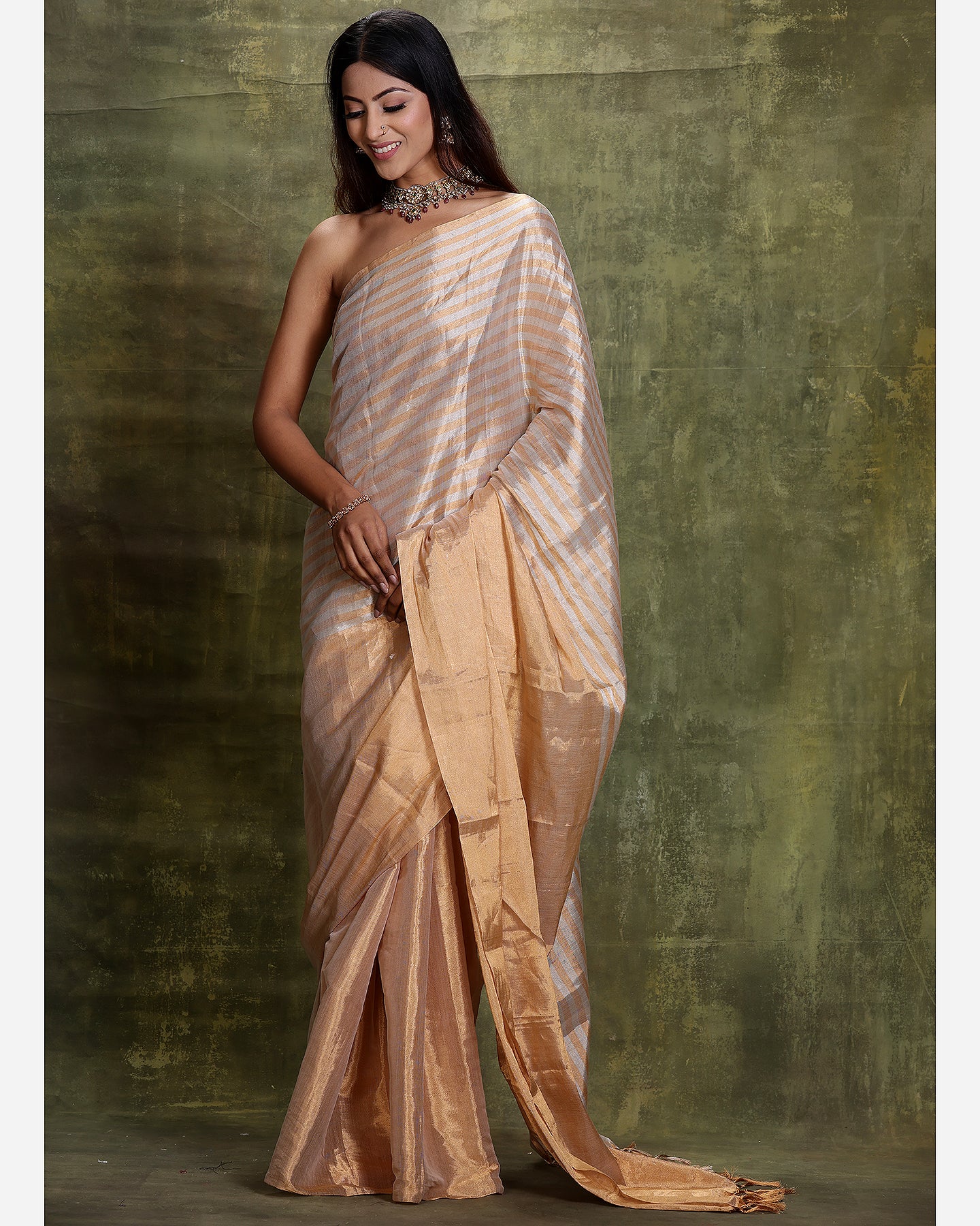 Handwoven, lustrous and light as air, this elegant Silk tissue saree in beige and gold is amust-have for your wardrobe.