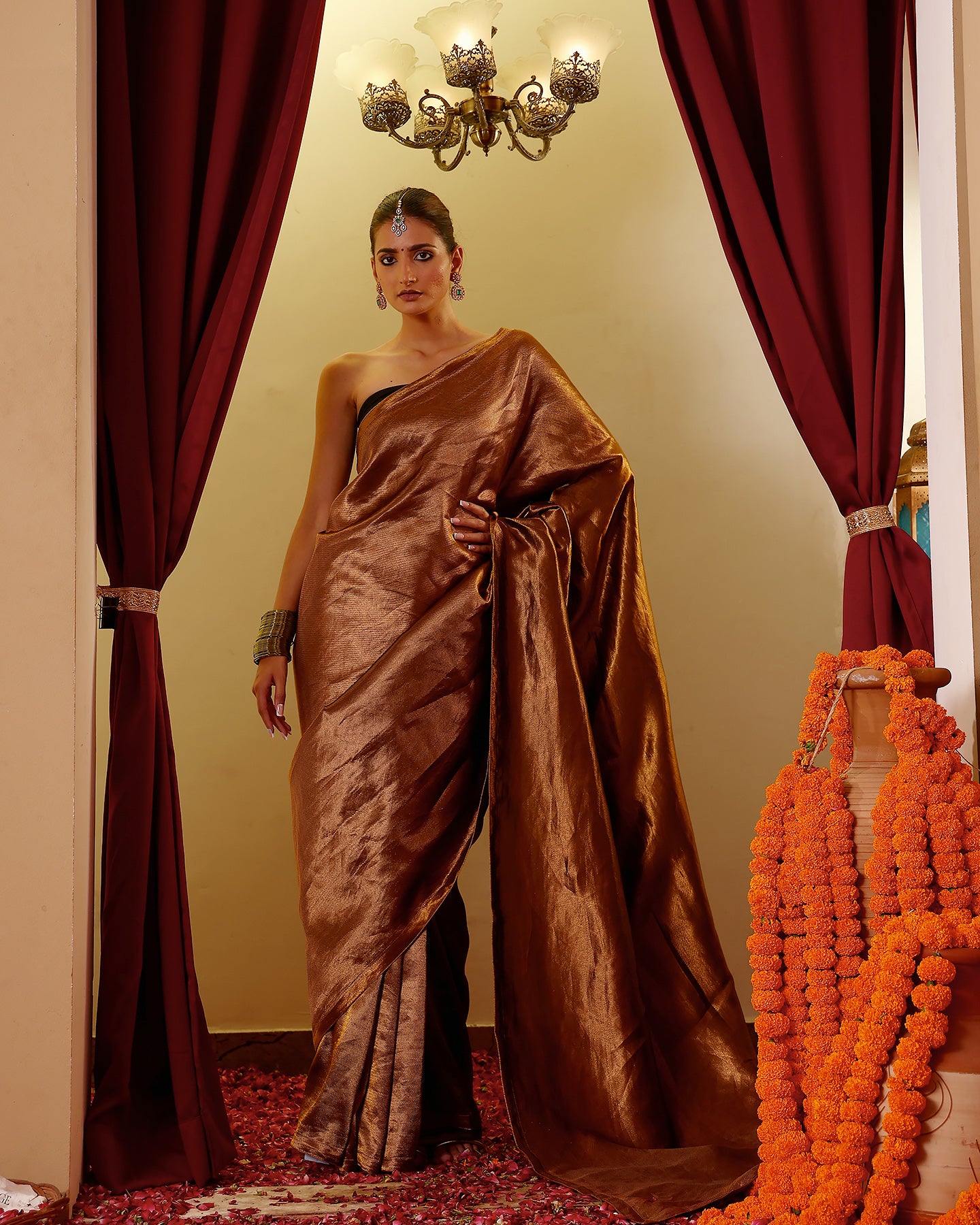 A vision of radiant sophistication, this handloom gold katan tissue saree embodies timeless grandeur woven in light. Crafted with precision on traditional banarasi looms, the saree shimmers in a molten gold hue that captures the essence of regal opulence. The lustrous katan silk base is interwoven with fine zari threads, giving it a metallic sheen that glows with every movement. Its smooth texture and subtle geometric weave pattern lend depth and dimension, while the fluid drape embraces the body with effortless grace. Styled minimally, the saree exudes a statement of quiet power — elegant, commanding, and eternally classic. A masterpiece of artisanal heritage, it celebrates the magic of gold — where tradition meets luxury, and every thread reflects the brilliance of banaras craftsmanship.