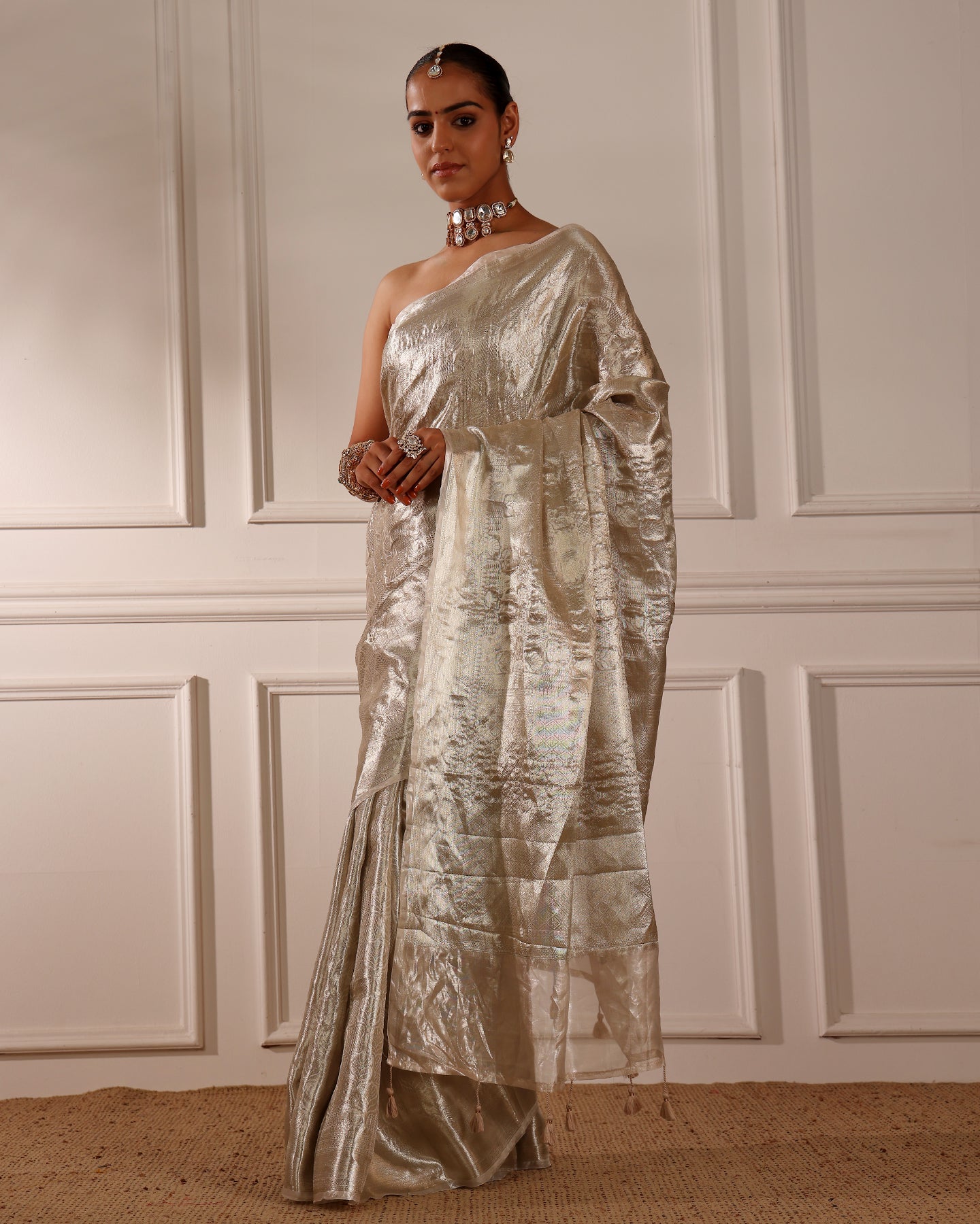 "Ethereal and elegant, this Ivory Woven Tissue Saree exudes timeless grace and sophistication. The sheer tissue fabric adds a subtle shimmer, perfect for both day and evening occasions. Its minimal design highlights the beauty of fine weaving and classic style. An ideal pick for weddings, rituals, or refined festive looks"