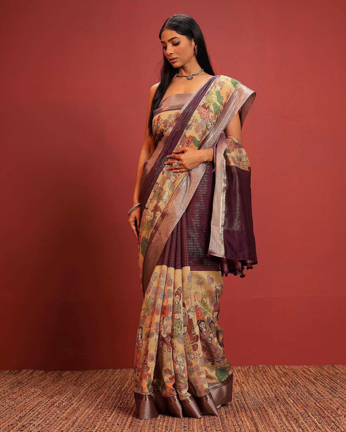Amazing Saree, Easy to drape, beautiful flow, pure katan silk tissue fabric, more than enough width so that anyone who's Tall or with heels vlcan drape it. Wore this on a wedding ceremony and got many compliments. Looks great with contrast blouse.