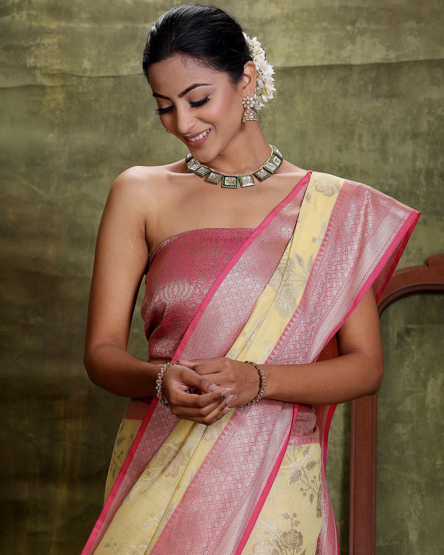 Silk Cotton Sarees, Evergreen & Timeless Sarees that evoke festivity & Joy. Classic weave featured on the saree make it a splendid drape. Bringing your finest weaves from Banaras in Light Lemon color. The Saree looks stunning and captivating on drape.