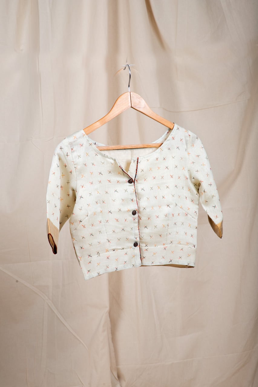 A front open blouse with piping on the neck,this a very light colour blouse with small motifs.