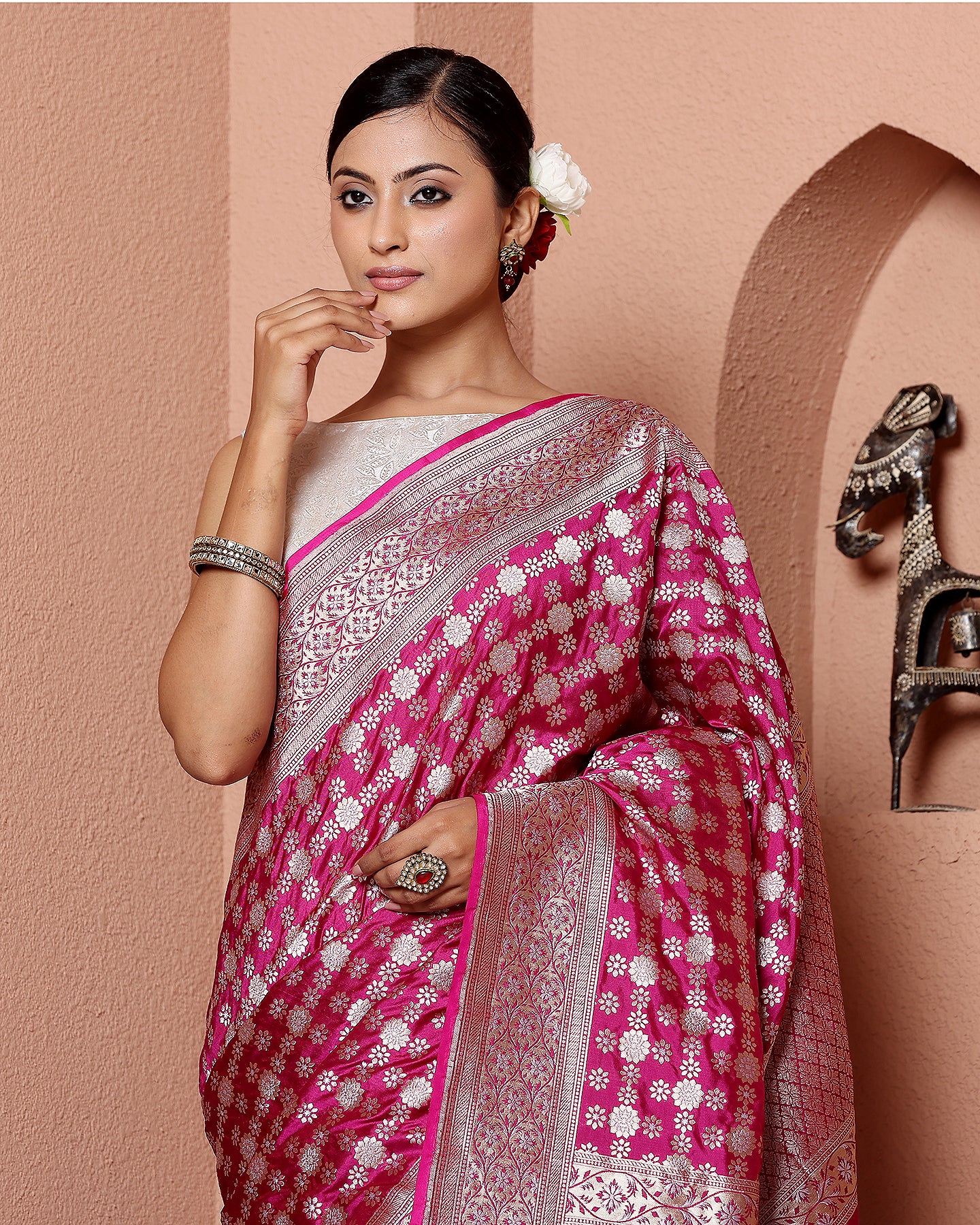 A distinctive Banarasi Classic stands out from the crowd in this gorgeous unmentionable drape. The beautiful motif pattern in the zari is resplendent Katan Silk.