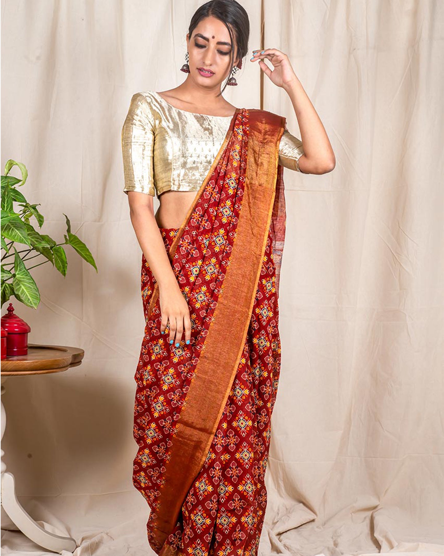 An entirely fabulous matka silk saree, it has a patola pattern on the body and pallu,the stunning red colour looks attractive yet subtle.