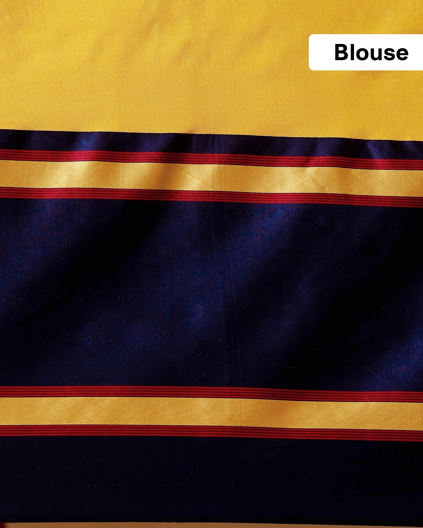 "A radiant symphony of tradition and modernity — this sunlit yellow mashru silk saree with bold navy and maroon striped borders celebrates the beauty of contrast. The smooth, glossy texture of mashru silk drapes gracefully, reflecting both heritage and high fashion. Paired with minimal jewelry and a confident stance, this look is bold, luxurious, and unmistakably timeless — perfect for festive evenings or statement celebrations.""