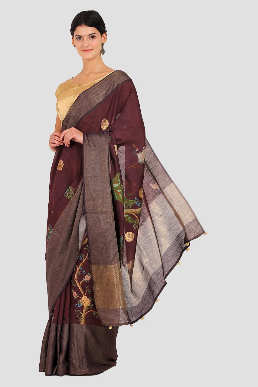 Stunning saree beautiful burgundy colour in moonga silk,The design is in wild flowers birds depicting free spirits, the stunner has golden zari motifs and has zari border and pallu.