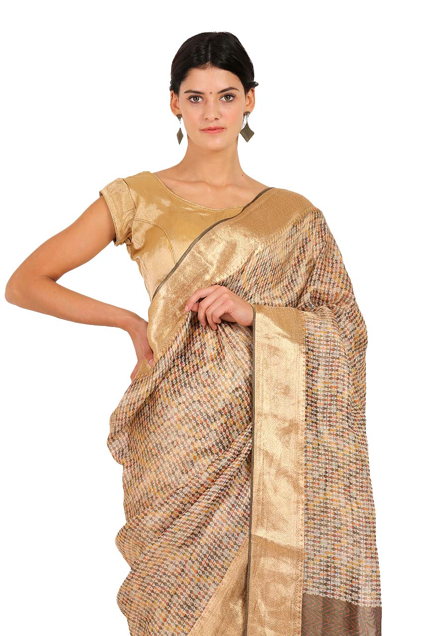As the saying goes less is more which truly justified the saree in gold tissue katan silk .The small abstract multicolor design all over looks very pretty and is complimented by the woven border.The pallu has pretty hand made tassels.