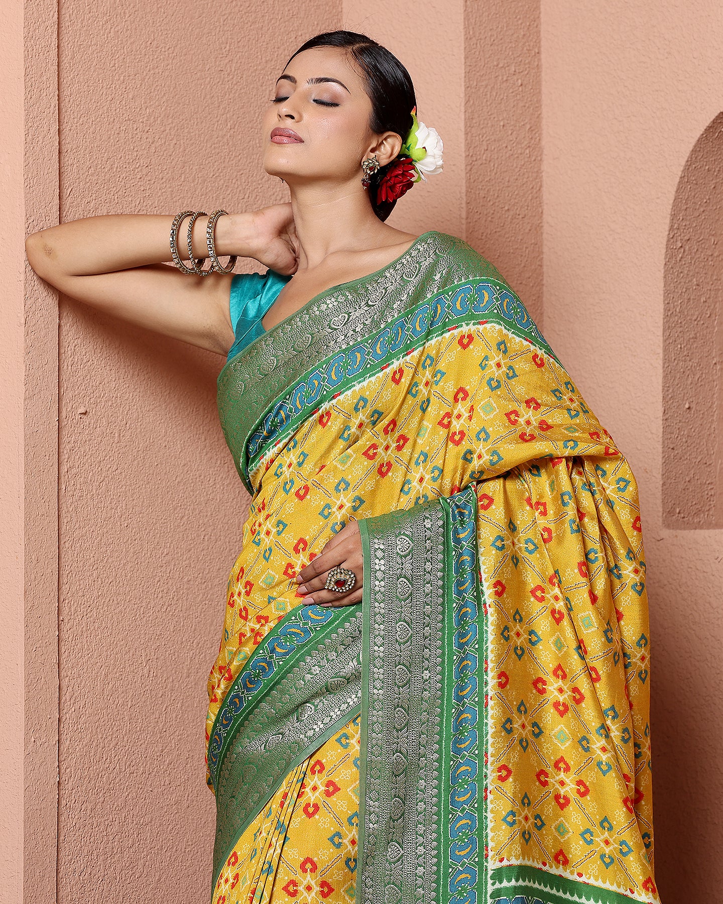 A very attractive saree with patola print and the rich woven border in contrast colour.