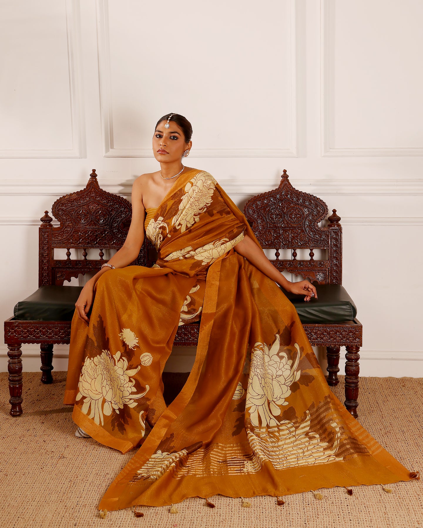 "Make a bold statement with this Mustard Tissue Mal Chanderi Saree, adorned with oversized floral motifs. The blend of tissue and Chanderi creates a graceful shimmer and lightweight drape. Its vibrant mustard hue and striking design exude festive elegance and charm. Perfect for day functions or festive gatherings, it’s a blend of tradition and trend. "