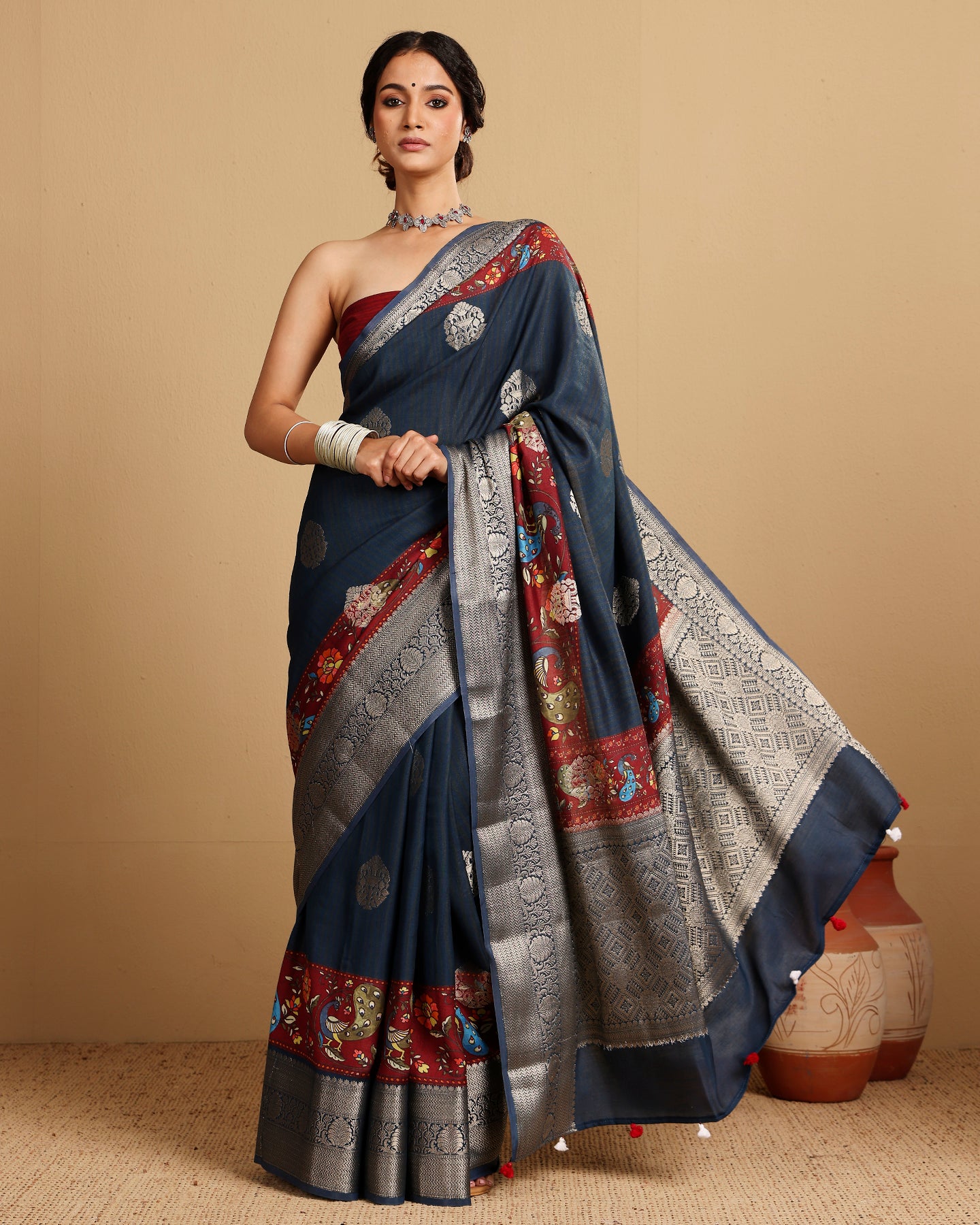 The Navy Blue Cotton Silk Woven Saree with Boota on the Body and Printed Peacock Border is a captivating blend of elegance and tradition. Its deep navy blue shade offers a timeless appeal, making it suitable for both casual and formal occasions. The intricately woven bootas adorn the body, showcasing exquisite craftsmanship and adding texture to the fabric. A vibrant printed peacock border enhances the saree's overall charm, bringing a pop of color and artistry to the design. This saree is perfect for those who appreciate a harmonious blend of contemporary style and traditional elements.