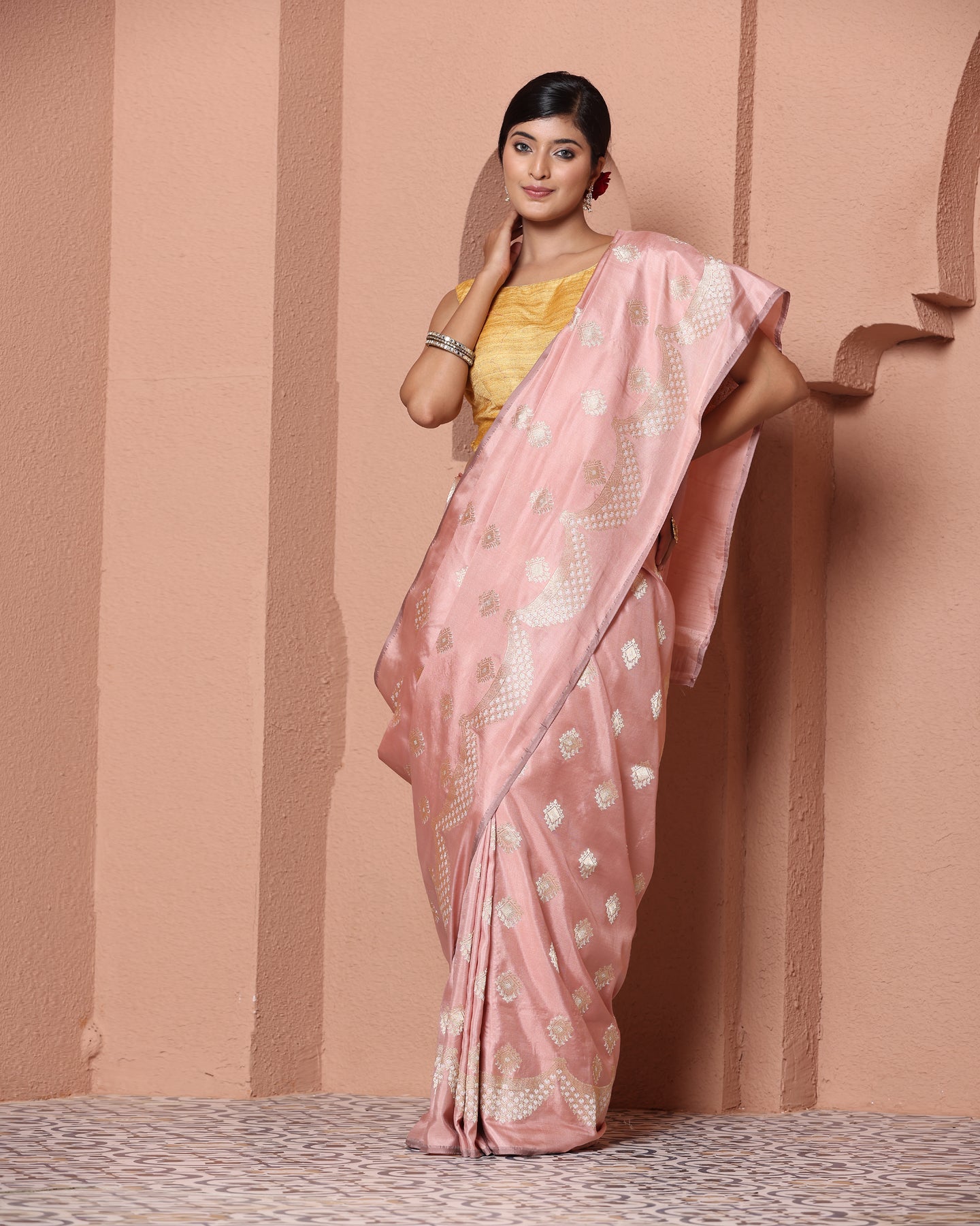 Our handloom rose color pink saree is a product of timeless craftsmanship. The fair Banarasi khadua makes it a statement peice and is perfect for festivals.