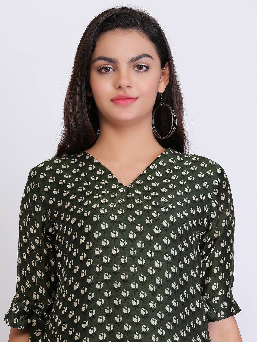 Drenched in the serene shade of olive green, this cotton silk top makes you look bit peppy and energetic. Carrying the gust of charm and seeking your attention with its classic hemline and well-fitted knot sleeves along with its floral print and timeless V-neck style.