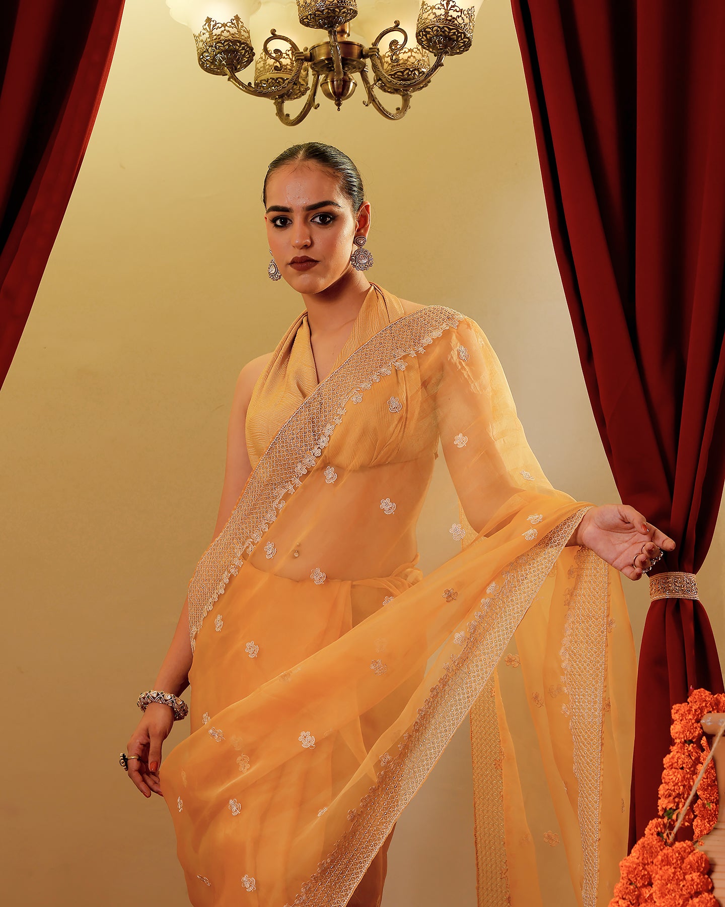 Organza embroidary saree draped in the warmth of sunlit amber, this exquisite organza saree is a testament to timeless craftsmanship. Adorned with delicate hand embroidery along the borders and sprinkled with floral motifs, it exudes sheer sophistication and feminine grace. The soft translucence of the organza, paired with a modern drape and a statement halter blouse, creates a look that’s effortlessly regal — perfect for festive gatherings, elegant soirées, and celebrations of art and heritage"