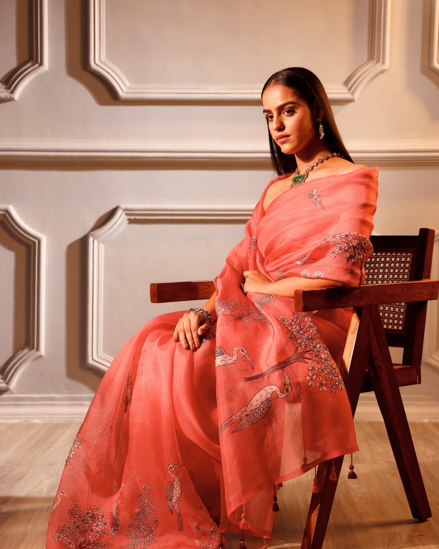 "Delicate and dreamy, this Strawberry Organza Saree is adorned with hand embroidery and charming bird-floral prints. The sheer fabric flows gracefully, adding a touch of ethereal elegance to your look. Intricate detailing enhances its artisanal appeal, perfect for intimate celebrations or festive brunches. A romantic blend of tradition and trend, it’s a saree that speaks timeless beauty. "