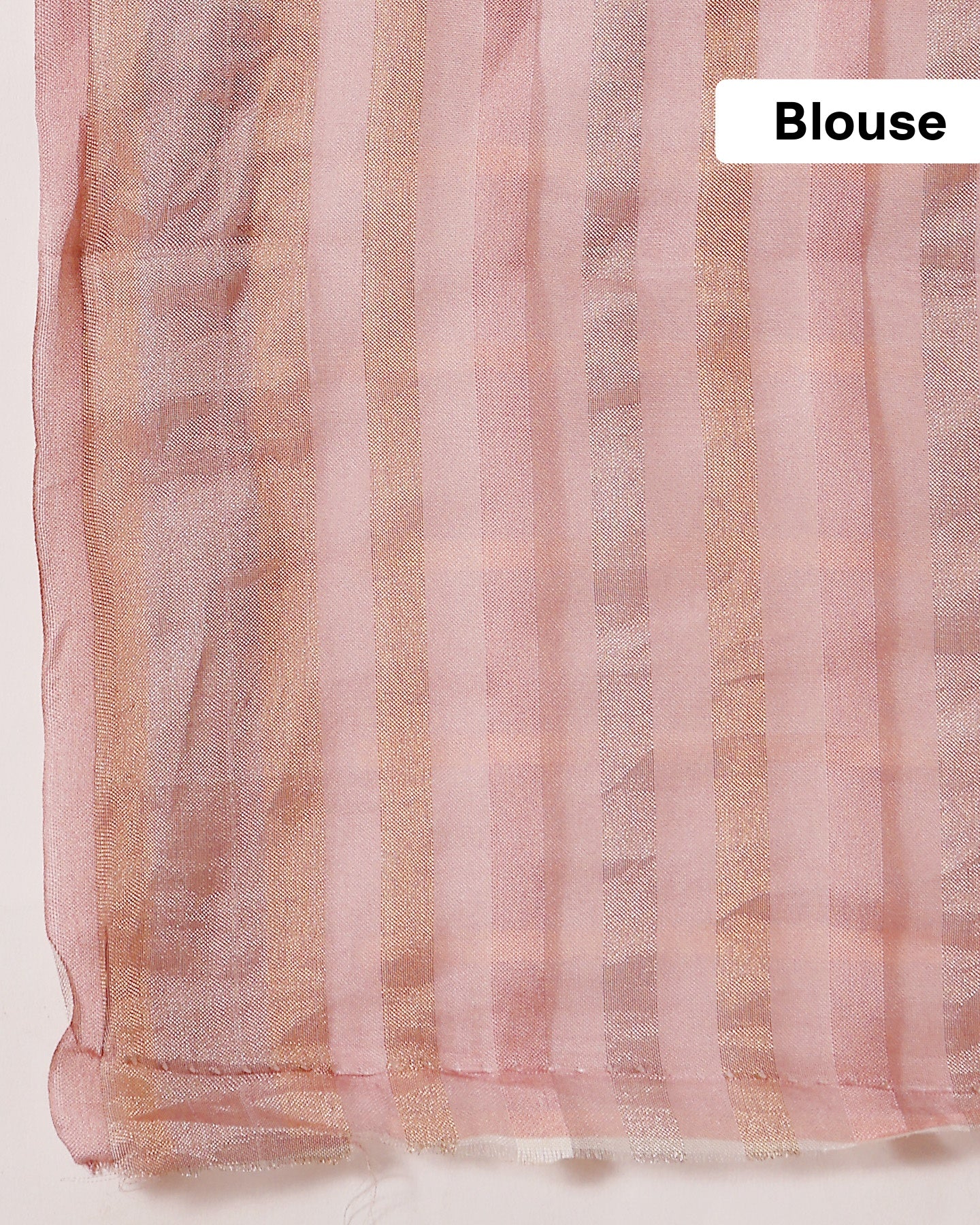 "Soft as a whisper and radiant as dawn, this rose-pink organza stripes saree blooms with delicate floral patterns and shimmering silver stripes. The ethereal texture of organza adds an airy grace, while the intricate print lends a romantic allure. Paired with elegant jewelry and a confident poise, this saree captures the essence of feminine beauty — perfect for soirées, festive occasions, and elegant celebrations."