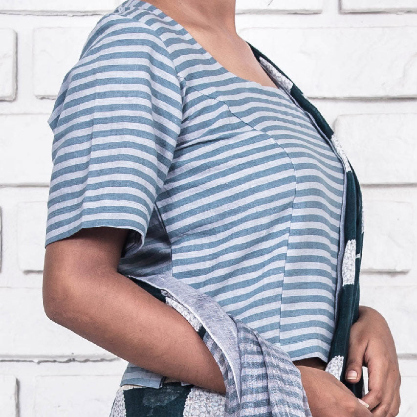 A smooth and soothing piece of Handloom Khadi cotton blouse with stripes of pastel blue and white and button enclosure at the back. Designed with round neck, this surely goes on well with light and dark toned cotton sarees.