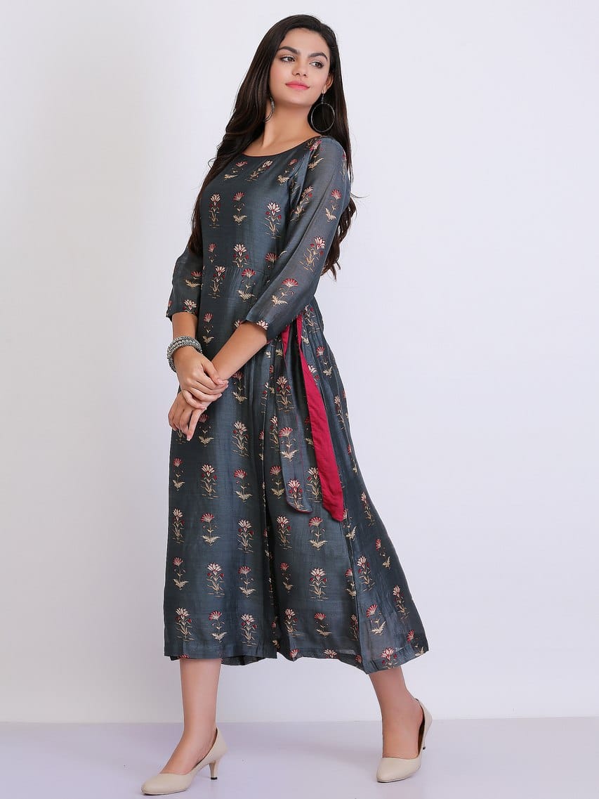 This elegant piece of cotton silk dress in the hues of pebble grey surely makes u stand out amidst the crowd. That slight hint of sheen and patterns of floral prints along with knot laces hanging on the waist side turn out to be too good to resist on a dinner date.