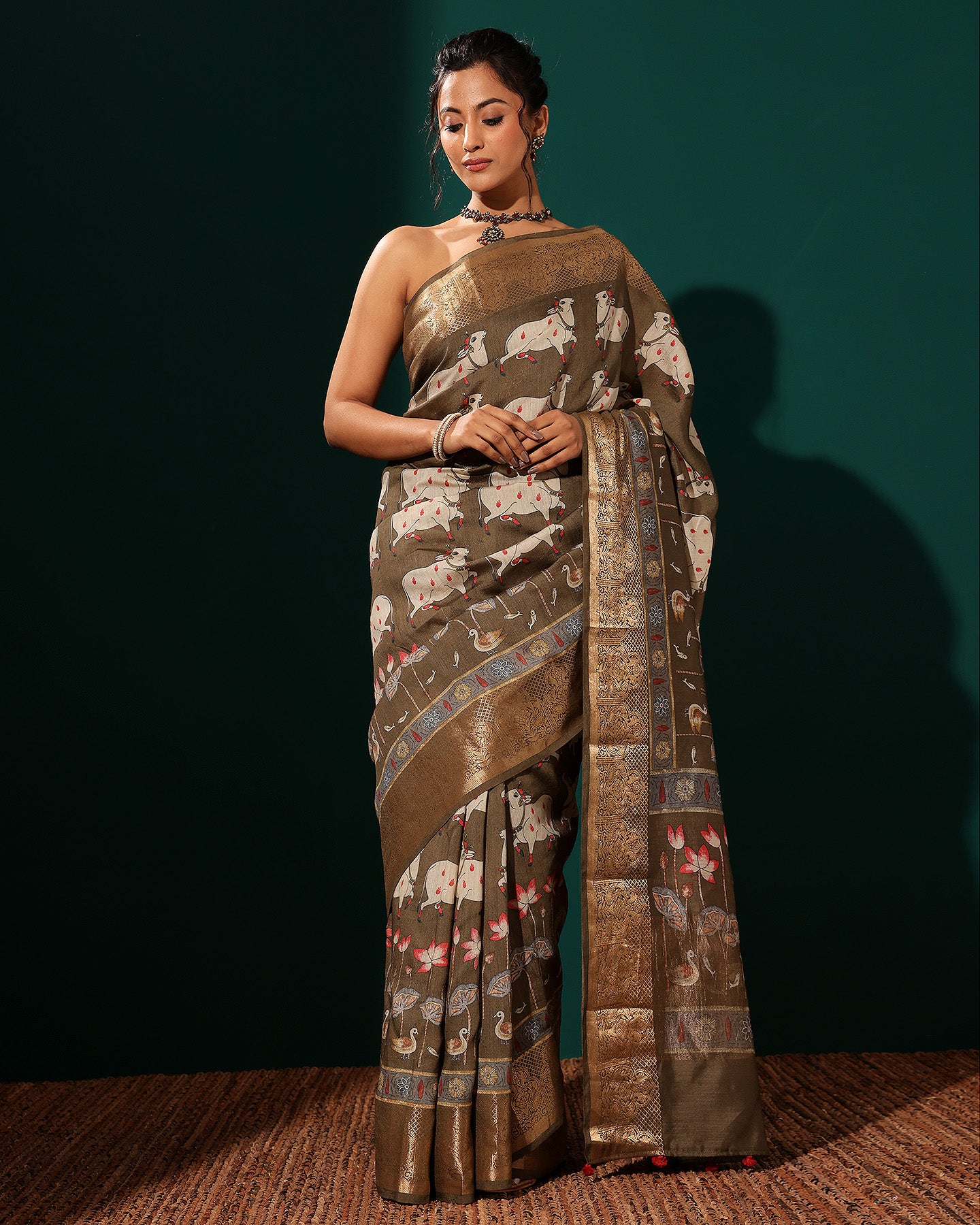 The Pichwai Moonga woven saree showcases intricate designs inspired by Pichwai artistry, crafted with luxurious Moonga silk. Known for its rich texture and vibrant hues, it captures the essence of traditional Indian motifs in every thread. Perfect for celebratory occasions, it blends cultural heritage with exquisite craftsmanship, making a striking cultural statement.