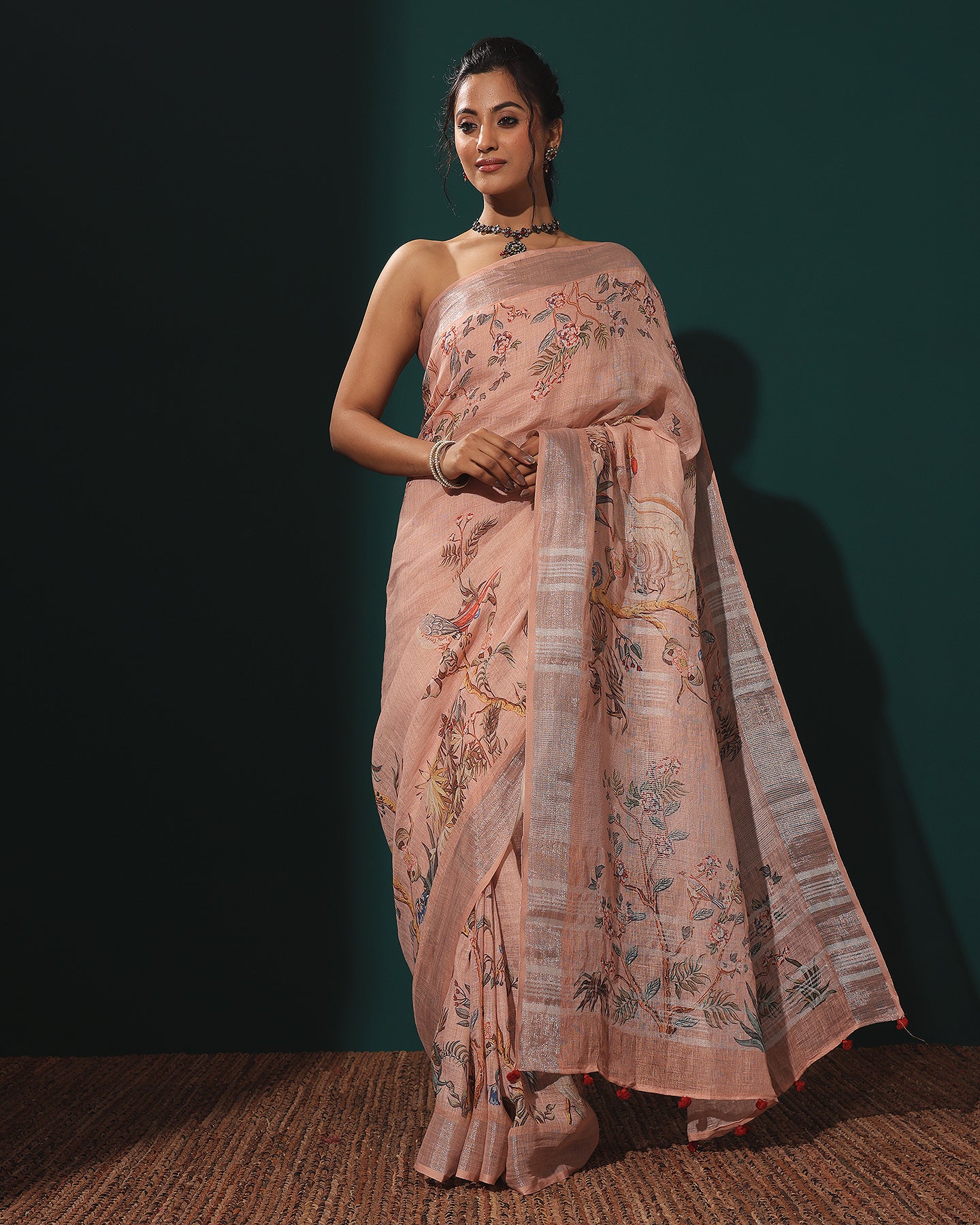 The pink floral linen saree combines the airy comfort of linen with a delicate floral motif in a charming pink hue. Perfect for casual outings or daytime events, it offers a graceful drape and subtle elegance. Ideal for those who appreciate natural fibres and artistic patterns, it blends comfort with timeless style effortlessly."