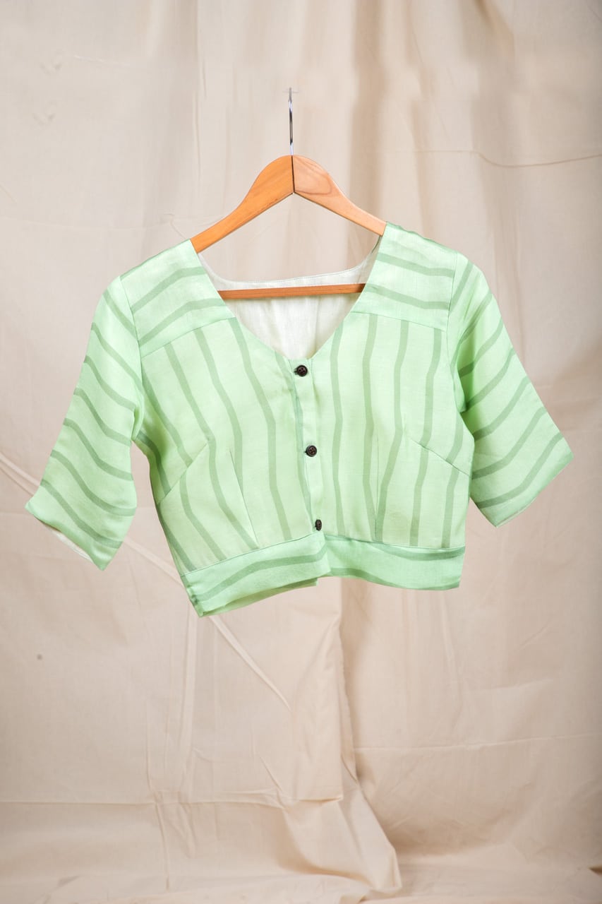 A very stylish V neck blouse,it has wooden buttons on the front,the stripes are horizontal and vertically placed.