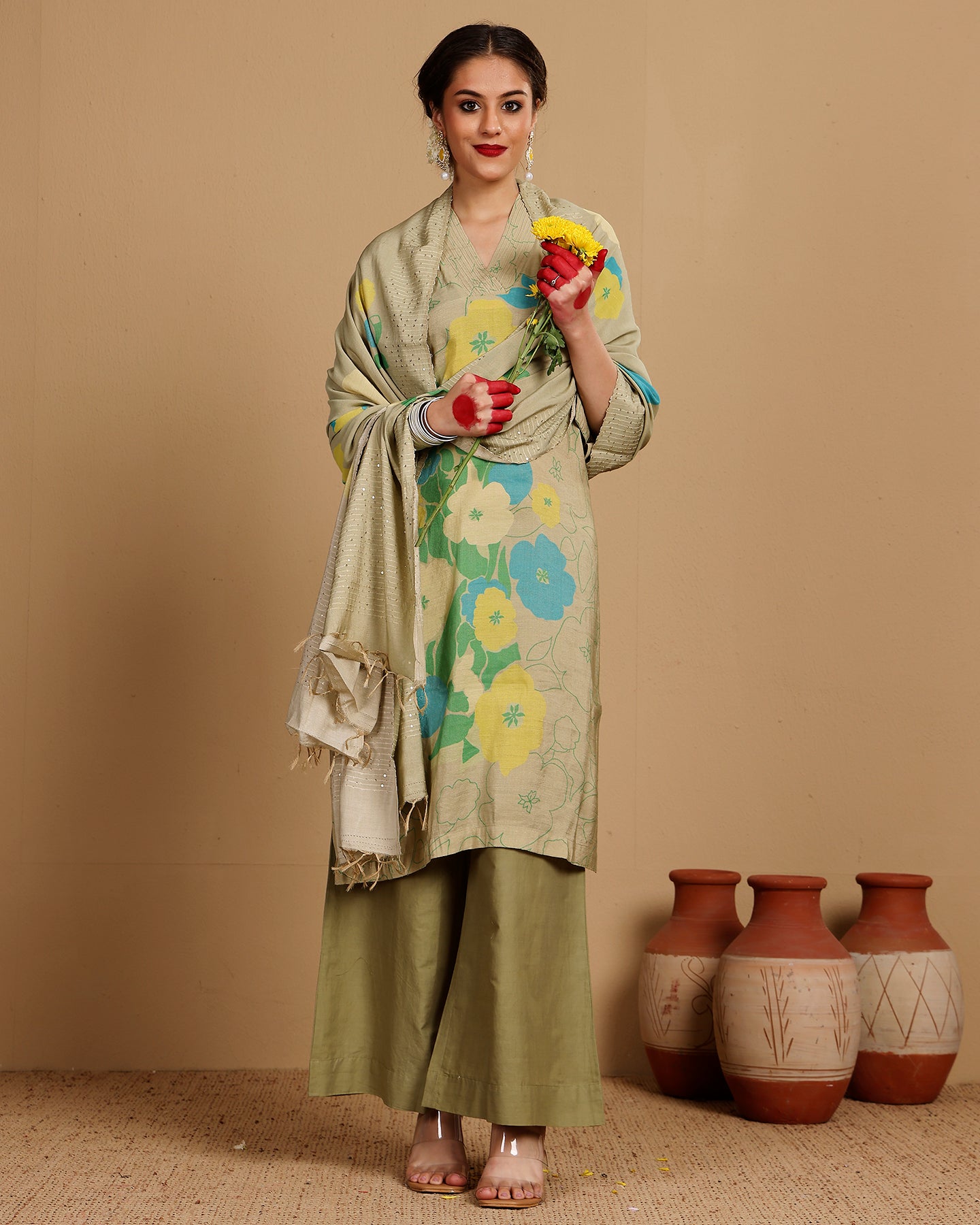 This dupatta features delicate sequin embellishments on luxurious tissue silk, offering a subtle shimmer that enhances both traditional and contemporary outfits.
