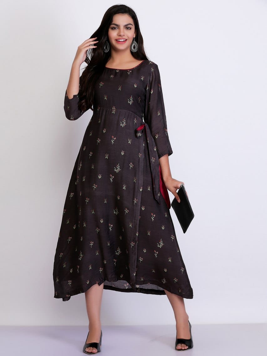 A fascinating piece of cotton silk dress dipped in the plum mauve shade. A side knot with hanging laces on the waist emanating the flashes of red in it makes it a treat to watch. Crisp 3/4th sleeves and the umbrella-shaped edges make it look so peppy and perfect to pair up with heels and danglers.