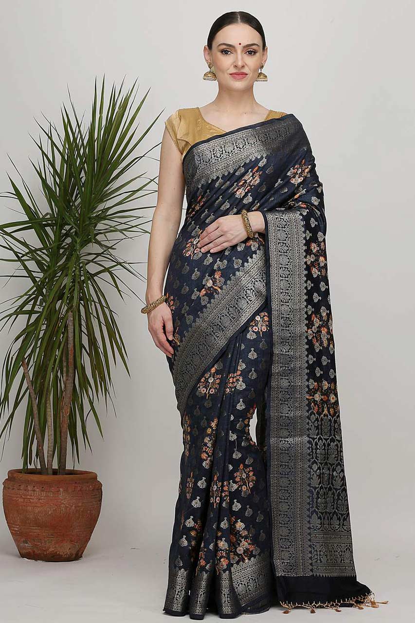 Enthralling and exhilarating!! This exactly sums up how unmissable this masterpiece is. Dipped in the calm tone of Prussian blue, this Katan silk handloom saree with woven anchal and zari border looks crisp with enriching digital floral prints.
