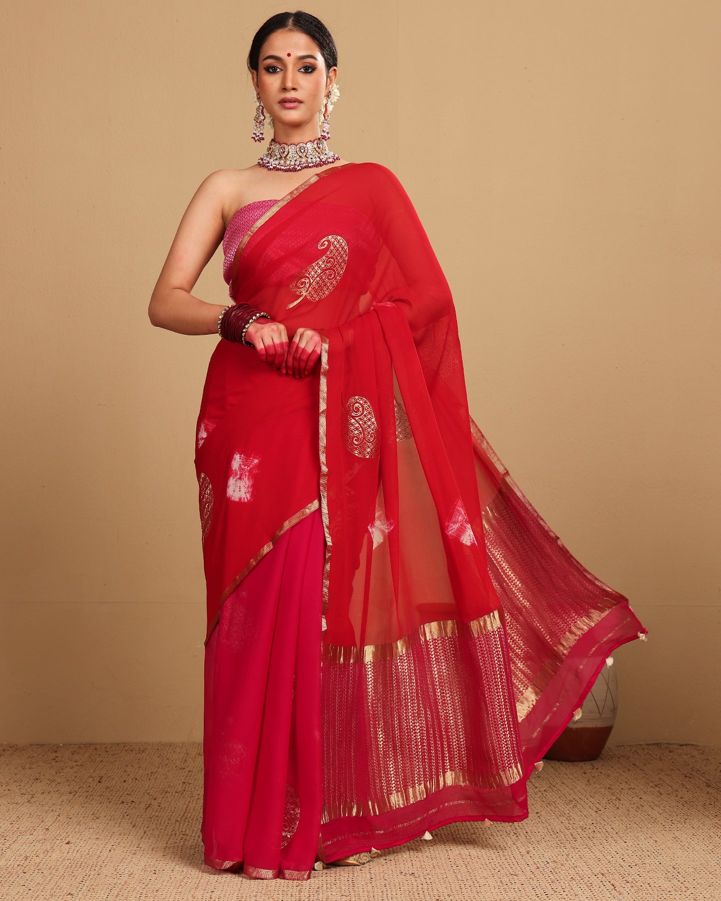 "A red Banarasi georgette saree is the epitome of grace, featuring a lightweight and flowy texture perfect for any occasion. Its intricate zari work adds a touch of sophistication, blending tradition with modern elegance. The vibrant red color enhances its allure, making it ideal for weddings and festive events. This delicate saree effortlessly combines comfort with timeless beauty."