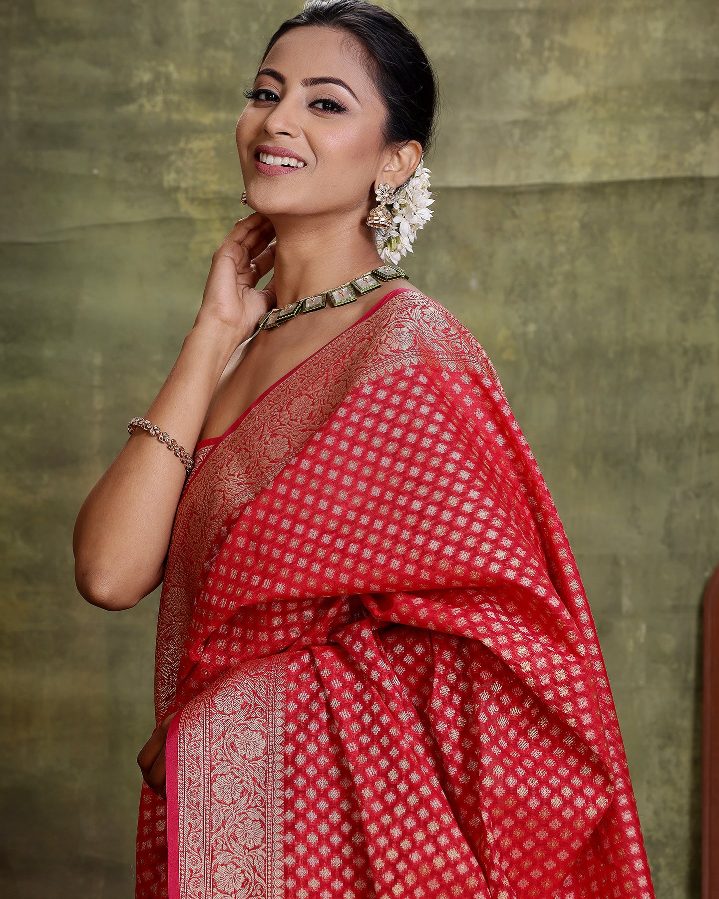 Silk Cotton Sarees, Evergreen & Timeless Sarees that evoke festivity & Joy. The classic weave featured on the saree make it a splendid drape. Bringing your finest weaves from Banaras in Red color. The Saree looks stunning and captivating on drape.