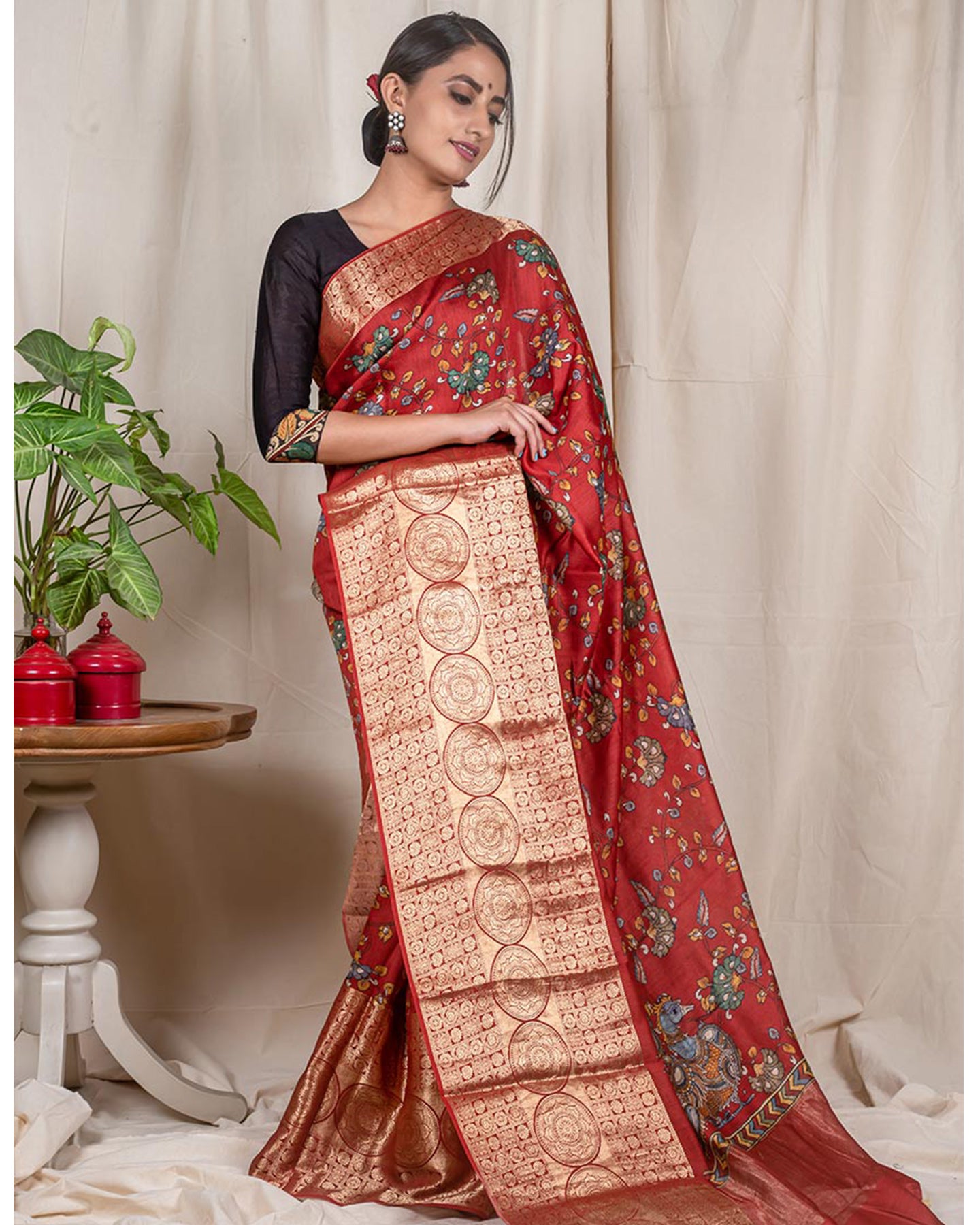 Few things can bring on the festive spirit like this vibrant kalamkari saree. the best blend of culture and gaiety in pure moonga silk.The classic saree has a rich handloom woven border.