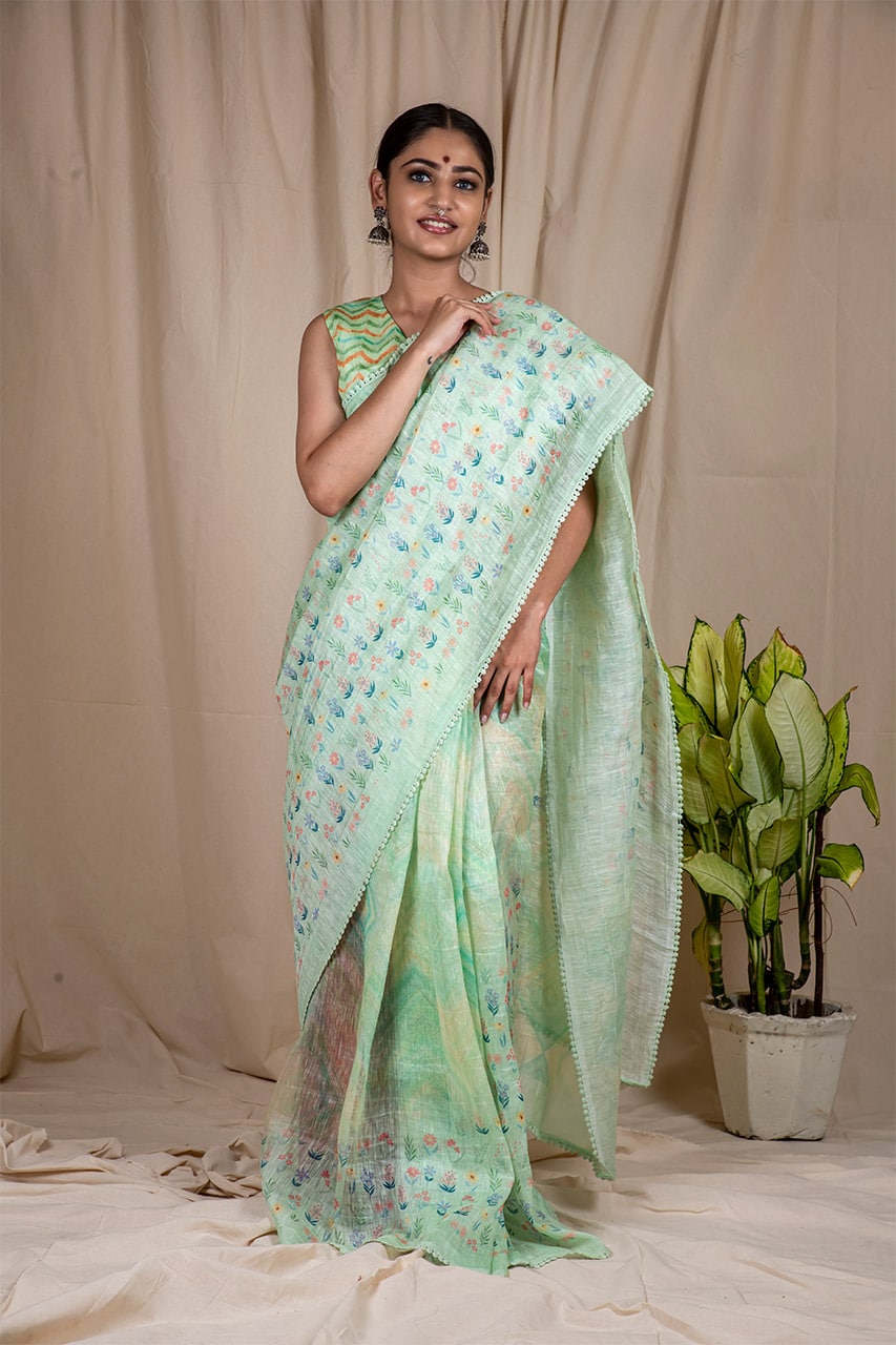 A captivating silk linen saree reminder  of spring.Adorned with small delicate flowers,it looks charming and classy.The pallu has handwoven lace at it edges .